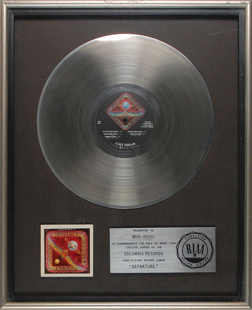 Official floater-style RIAA platinum record sales award commemorating the sale of more than 1,000,000 copies of the Columbia Records long-playing record album ‘Departure.’ Disc is framed with its plate and a color reproduction of the album cover to an overall size of 16.75 x 21. Award retains its original backing complete with the Creative Glassics label affixed to the bottom right corner. In fine condition. RR Auction COA.