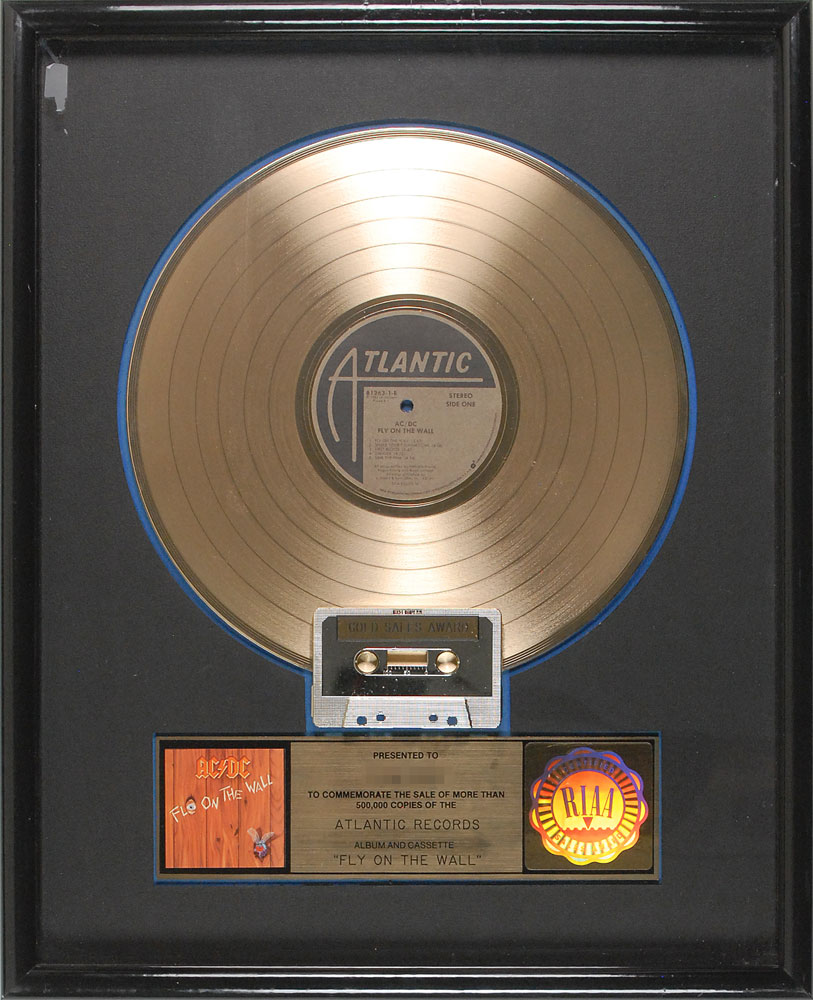 Official flower hologram-style RIAA gold sales award commemorating the sale of more than 500,000 copies of the Atlantic Records album and cassette ‘Fly On The Wall.’ Framed with the gold disc, cassette and plaque with an image of the album cover to an overall size of 17 x 21. In fine condition. RR Auction COA.