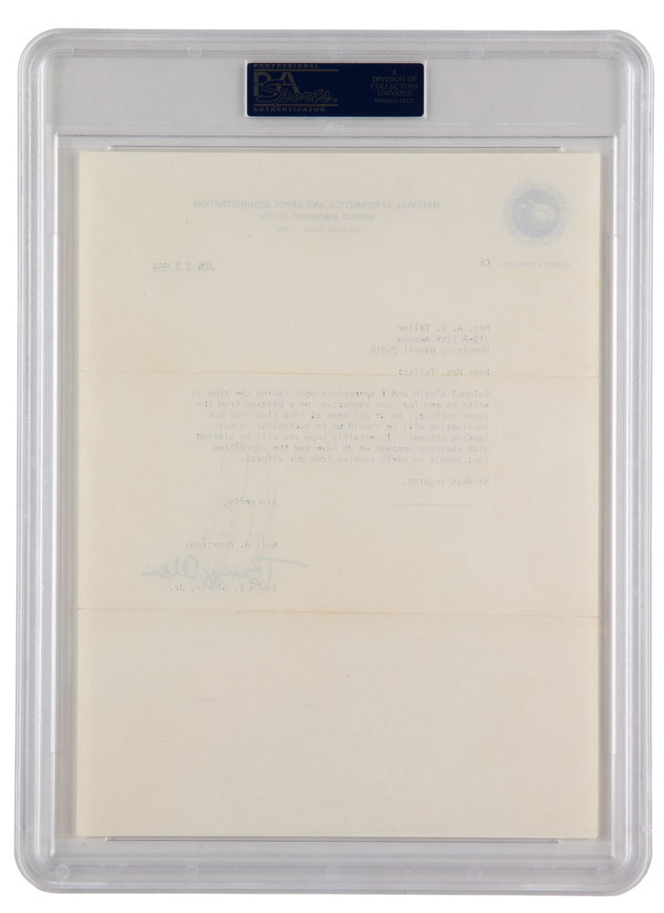 TLS, one page, 8 x 10.5, NASA letterhead, stamp-dated June 23, 1969. Letter of thanks to a woman in Honolulu, Hawaii, written just three weeks before the launch of Apollo 11. In full: "Colonel Aldrin and I appreciate your taking the time to write us for your suggestion on a message from the lunar surface. We do not know at this time what our inclination will be should we be successful in our landing attempt. I certainly hope you will be pleased with whatever message we do have and the impressions that people on earth receive from our efforts." Encapsulated in a plastic PSA/DNA authentication holder, evaluating the autographs as "MINT 9." In fine condition, with Armstrong's flourish lightly affecting Aldrin's signature, and the opening stroke of another Armstrong signature, inadvertently started in Aldrin's space. Accompanied by a printed Apollo 11 mission information sheet from NASA, as well as the original mailing envelope, and a couple of news clippings mentioning Armstrong's and Aldrin's moonwalks and possible statements when touching the lunar surface.