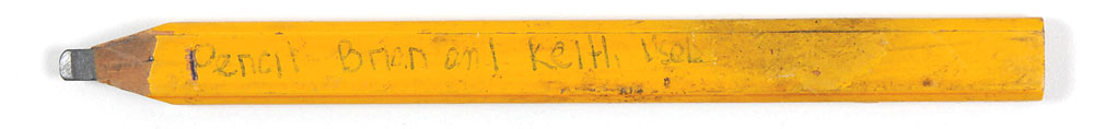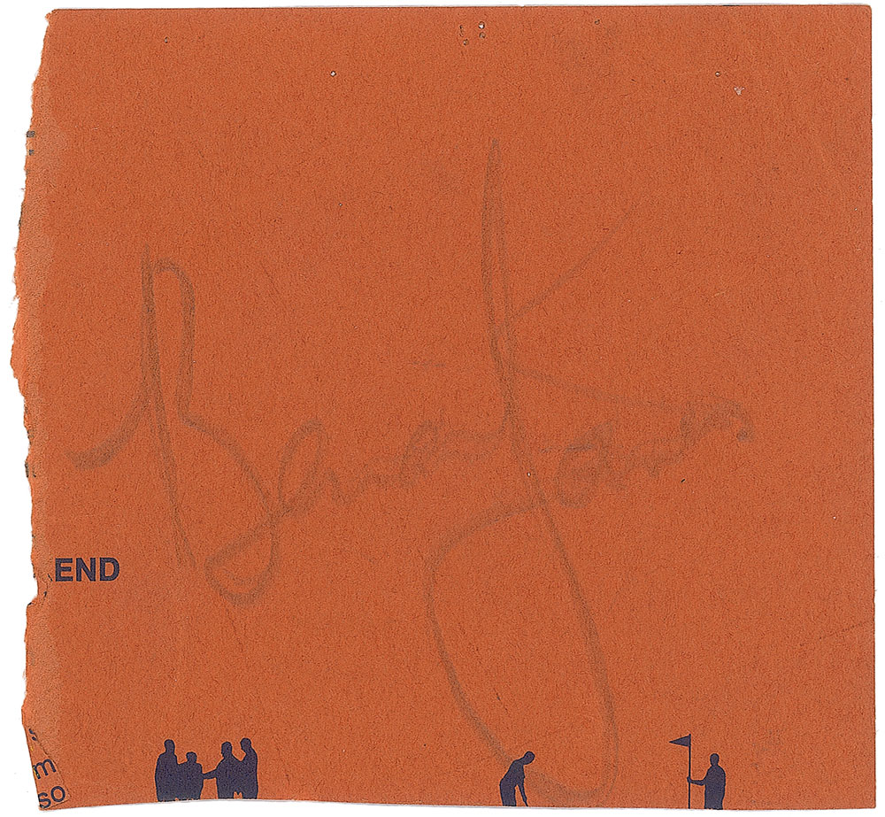 Pencil signature, “Brian Jones,” on a light brown 3.25 x 3 slip taken from a larger brochure page. Accompanied by the pencil used by Jones, with a collector’s notation written along the pencil which reads, “Pencil Brian and Keith used.” In fine condition, with signature a shade or two light, but still completely legible. Signature was obtained in Los Angeles in 1964. Pre-certified Roger Epperson/REAL and RR Auction COA.
