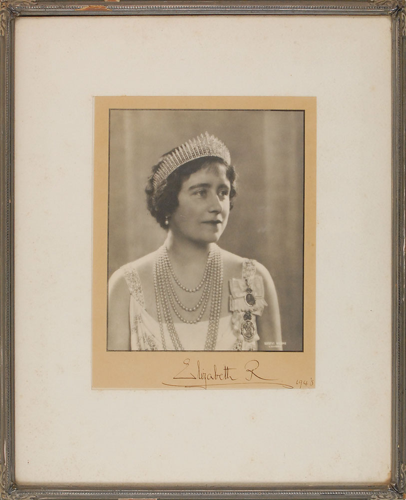 Vintage matte-finish 7 x 9 Dorothy Wilding photo of Elizabeth in a tiara and pearls, signed in the lower border in fountain pen, “Elizabeth R, 1945.” Photo is matted and housed in its original frame to an overall size of 12.75 x 16. In fine condition, a uniform shade of toning to borders, some scattered foxing to mat, and a few chips to frame. Pre-certified PSA/DNA and RR Auction COA.