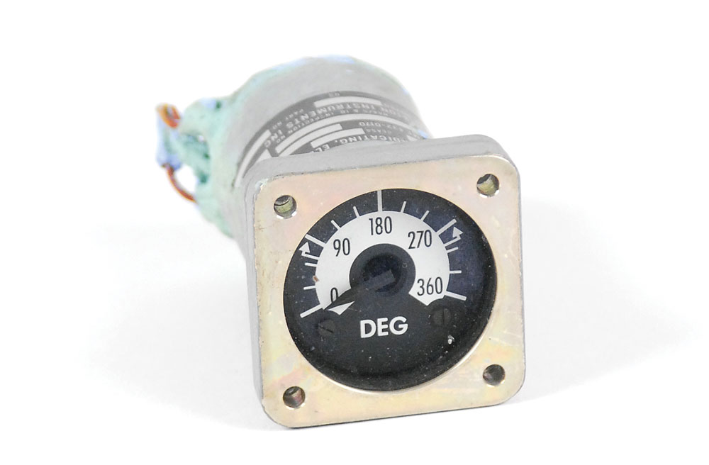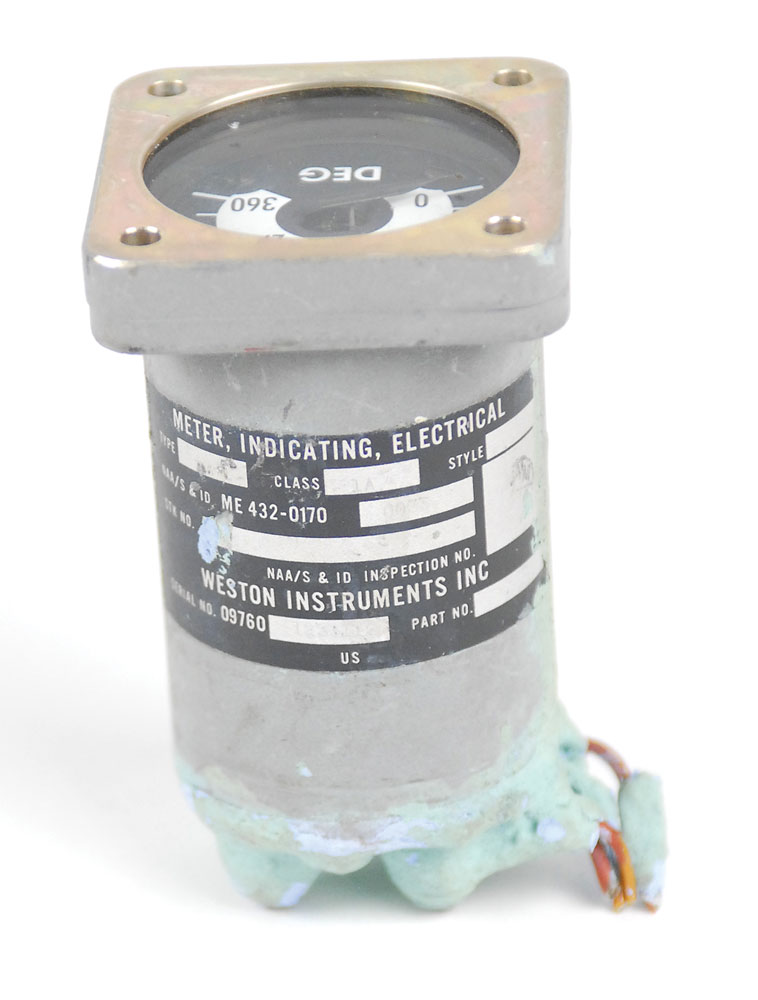 Apollo Command Module Block II Gauge. Gauge measures 1.75 x 1.5 x 3.75 and is calibrated from 0–360 degrees. A Weston Instruments Inc. Label is affixed to the housing and reads: “Meter, Indicating, Electrical…Class 1A…Serial No. 097601233112.” In fine condition.