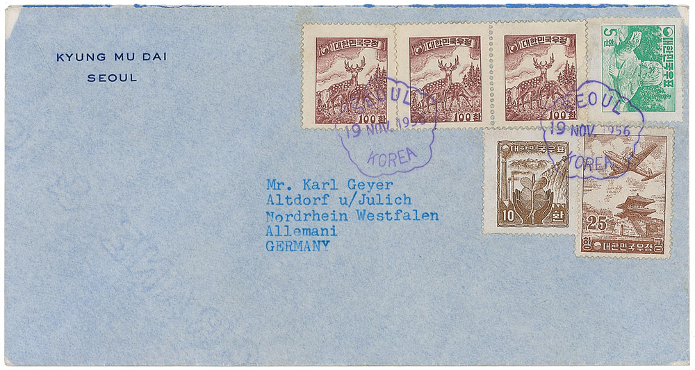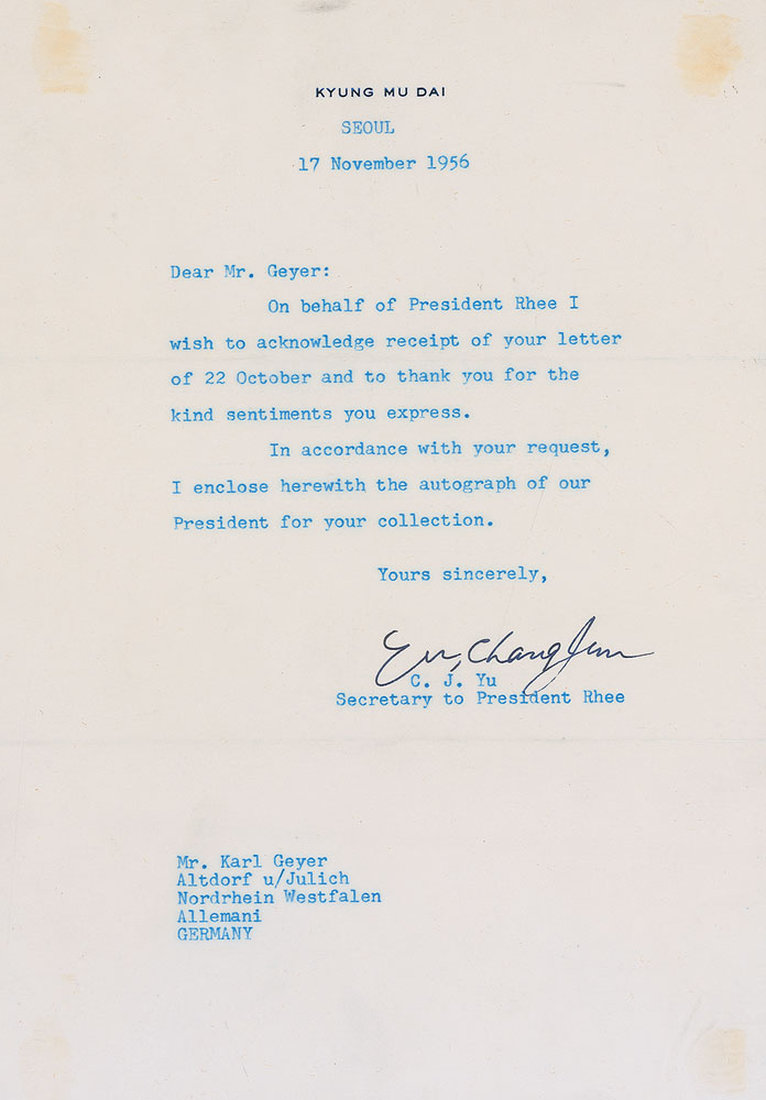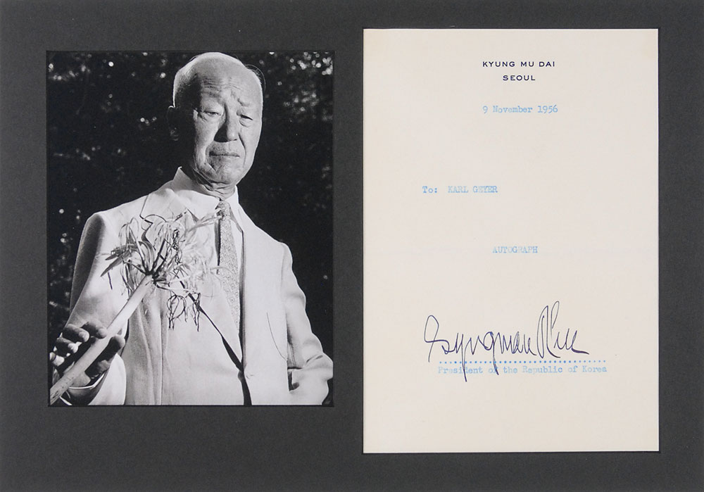 First President of South Korea (1875–1965) from 1948 until his resignation in 1960. Fountain pen signature, “Syngman Rhee,” on an off-white 5 x 7 sheet of Kyung Mu Dai letterhead. Matted with an unsigned photo to an overall size of 11.75 x 8.25. In fine condition. Accompanied by the original mailing envelope and transmittal letter from his office, dated November 17, 1956. RR Auction COA.