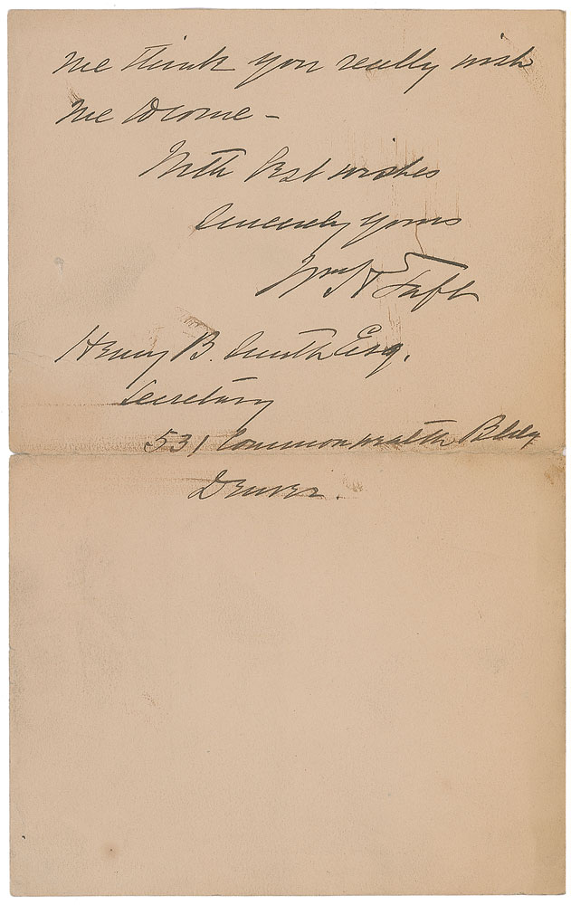 ALS signed “Wm. H. Taft,” two pages on two adjoining sheets, 5 x 8, On Board Twin Screw S.S. ‘Fort Victoria’ letterhead, December 28, 1920. Letter to Henry Smith, Secretary of the Colorado Education Association. In full: “I have your cordial letter of November 27th. It had not been forwarded to me when on a long western trip and I only got it as I came on board. I can’t see my way to being in Colorado in October next. My regular program would keep [me] in New Haven during the past half of the school year, seven hours a week. I am sorry because your kind insistence makes me think you really wish me to come.” Small separation to central horizontal fold of second page and light toning otherwise fine condition. Accompanied by the original mailing envelope. Pre-certified PSA/DNA.