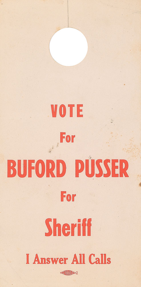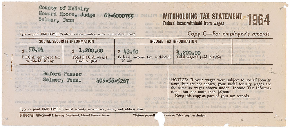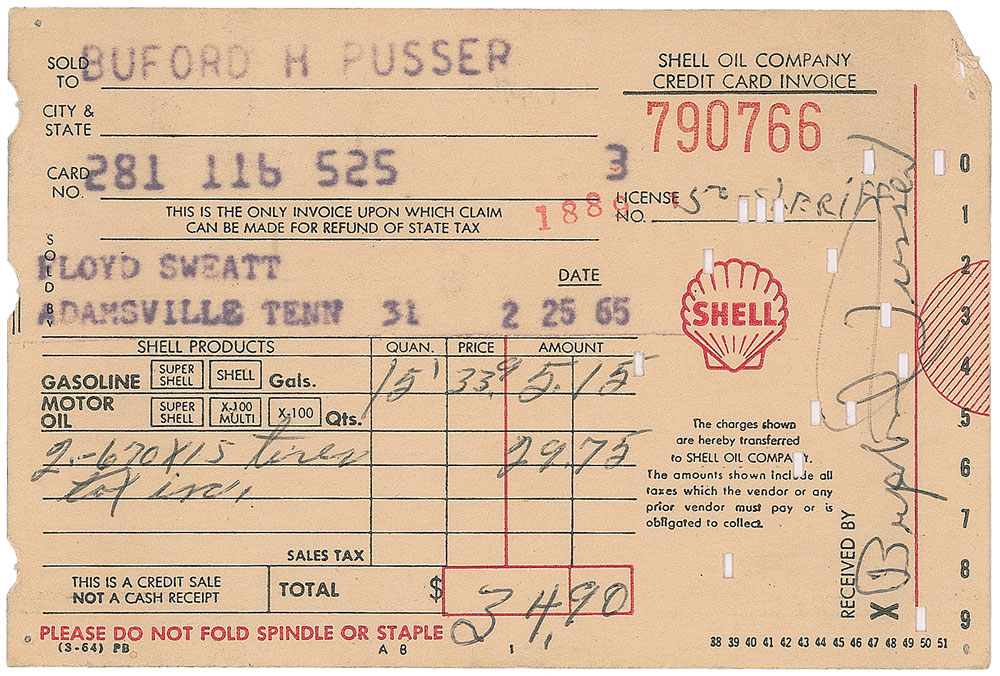 Legendary no-nonsense Tennessee lawman (1937–1974) whose story was adapted into the popular Walking Tall films. He died at the age of 36 in an auto accident that many believe to have been the result of foul play. Shell credit card receipt, 4.75 x 3.25, dated February 25, 1965, for gas and two tires for his sheriff’s car, signed vertically along the right edge by Pusser. In fine condition, with a couple small cancellation holes around signature. Accompanied by an unsigned 1964 Withholding Tax Statement and a “Pusser for Sheriff” campaign rear window hanger. RR Auction COA.