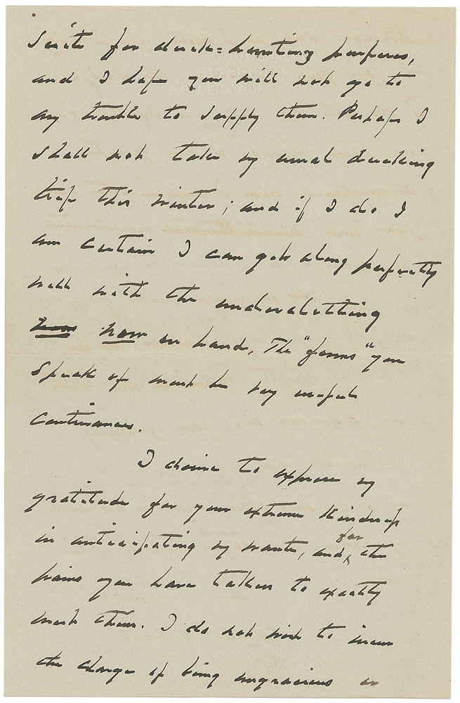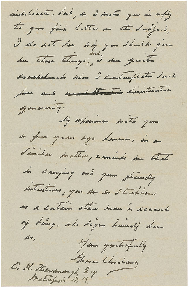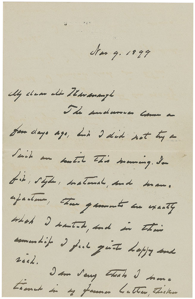 ALS, three pages on two adjoining sheets, 4.5 x 7, personal letterhead, November 9, 1899. Letter to C. H. Kavanaugh. In part: “The underwear came a few days ago, but I did not try a suit on until this morning. For fit, style, material, and manufacture, these garments are exactly what I wanted…I feel quite happy and rich. I am sorry that I mentioned in my former letter, thicker suits for duck-hunting purposes, and I hope you will not go to any trouble to supply them. Perhaps I shall not take my usual ducking trip this winter, and if I do I am certain I can get along perfectly well with the underclothing now in hand…My experience with you a few years ago…reminds me that in carrying out your friendly intentions, you are as stubborn as a certain other man is accused of being.” In fine condition. Accompanied by the original mailing envelope, addressed in Cleveland’s hand. Pre-certified John Reznikoff/PSA/DNA and RR Auction COA.