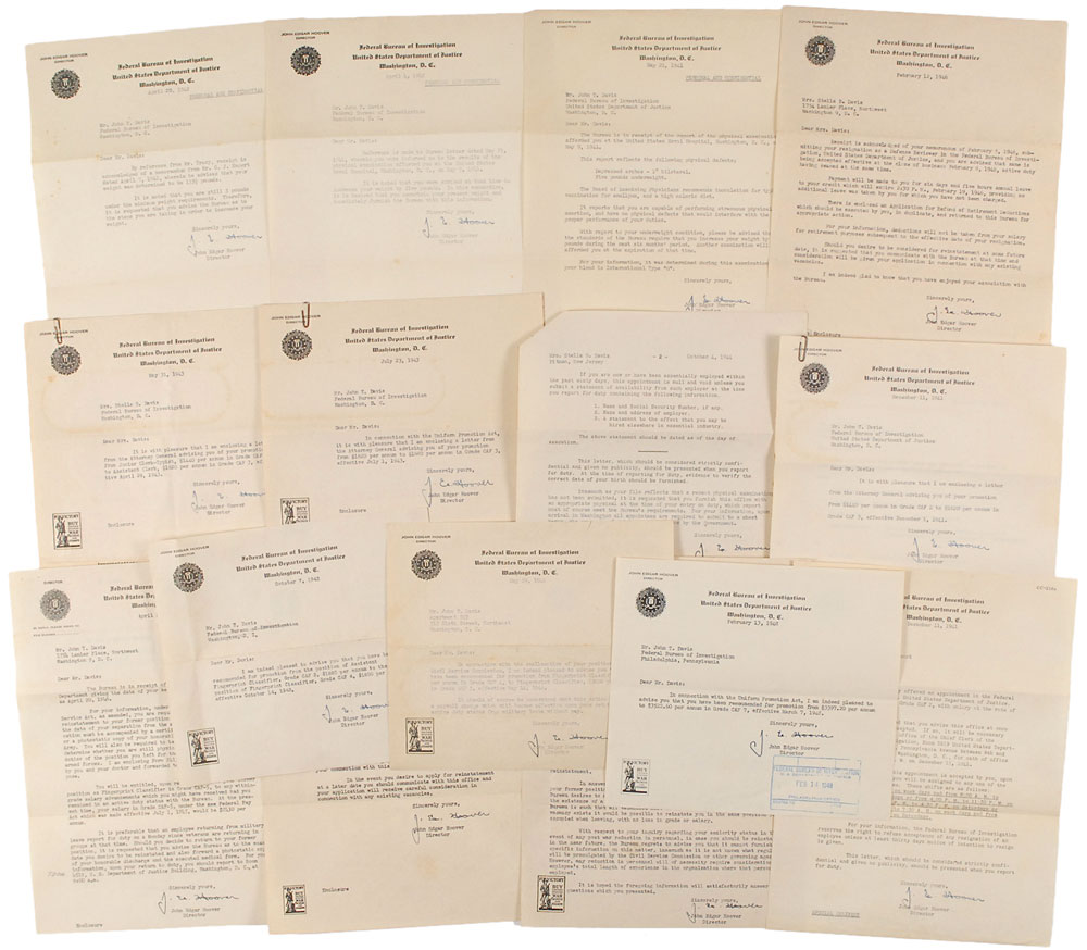 Collection of 15 TLSs, all to FBI employees John and Stella Davis, various sizes, ranging in date from 1940 to 1948, all on FBI letterhead and all signed by Hoover. John Davis was a fingerprint classifier, and Stella Davis was a clerk-typist and defense reviewer. Letters contain FBI content pertaining to employment, promotions, and salary upgrades, with several of the letters marked “personal and confidential.” Also included are ten letters with printed signatures, several original transmittal envelopes, a few letters from other FBI personnel to the Davises, and three Western Union telegrams. In overall very good condition. RR Auction COA.
