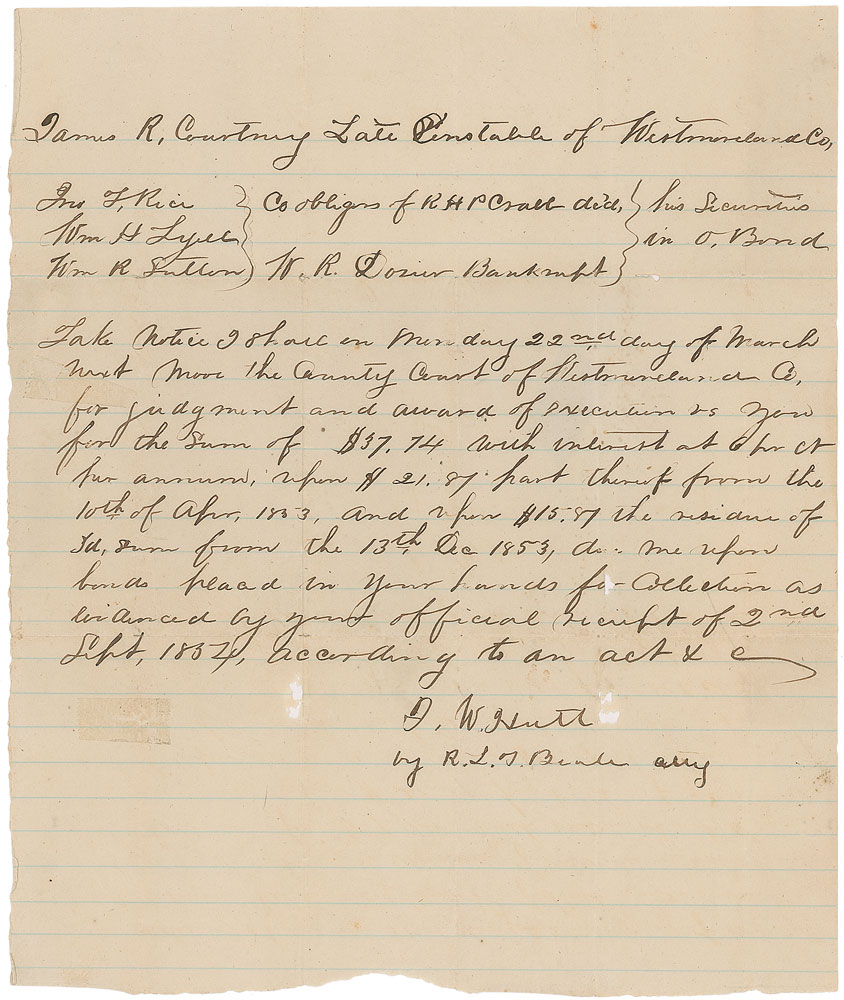 Lawyer, three-term congressman from Virginia, and Confederate brigadier general (1819–1893). ALS signed “R. L. T. Beale atty,” one page, lightly-lined, 7.75 x 9.25, no date. Letter concerning a legal case. In part: “Take notice I shall on Monday 22nd day of March next move the County Court of Westmoreland Co for judgment and award of execution vs you for the sum of $37.74.” In very good condition, with several intersecting folds (two vertical folds passing through the signature), a few small areas of paper loss, and an unobtrusive tape remnant to left side. RR Auction COA.