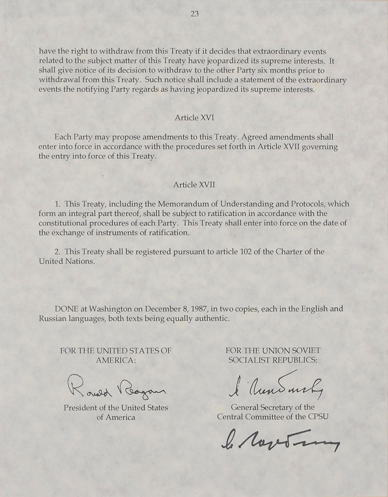 Limited edition souvenir treaty signed “M. Gorbachev,” one page, 8.25 x 10.5, numbered 225/299. Reproduction of the final page of the Nuclear Arms Reduction Treaty, December 8, 1987, signed in black felt tip by Gorbachev. Double-matted and framed with a photo of Reagan and Gorbachev to an overall size of 24.25 x 16.25. In fine condition. Accompanied by a certificate of authenticity from The Score Board, Inc. Oversized. Pre-certified PSA/DNA and RR Auction COA.