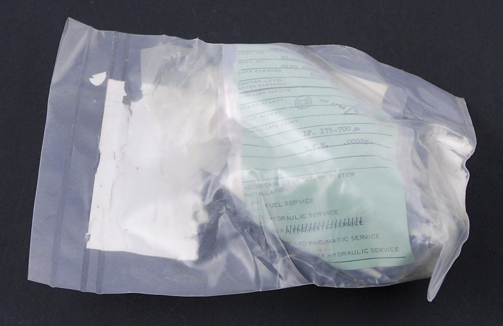 Saturn V S-IC ground support fluid coupling, serial no. 0000019, measuring approximately 5.5″ long, made by Purolator. Coupling is housed in its clean room packaging along with two cleaning tags. A Purolator label, dated September 28, 1966, is affixed to the outside of the bag. In fine condition. RR Auction COA.