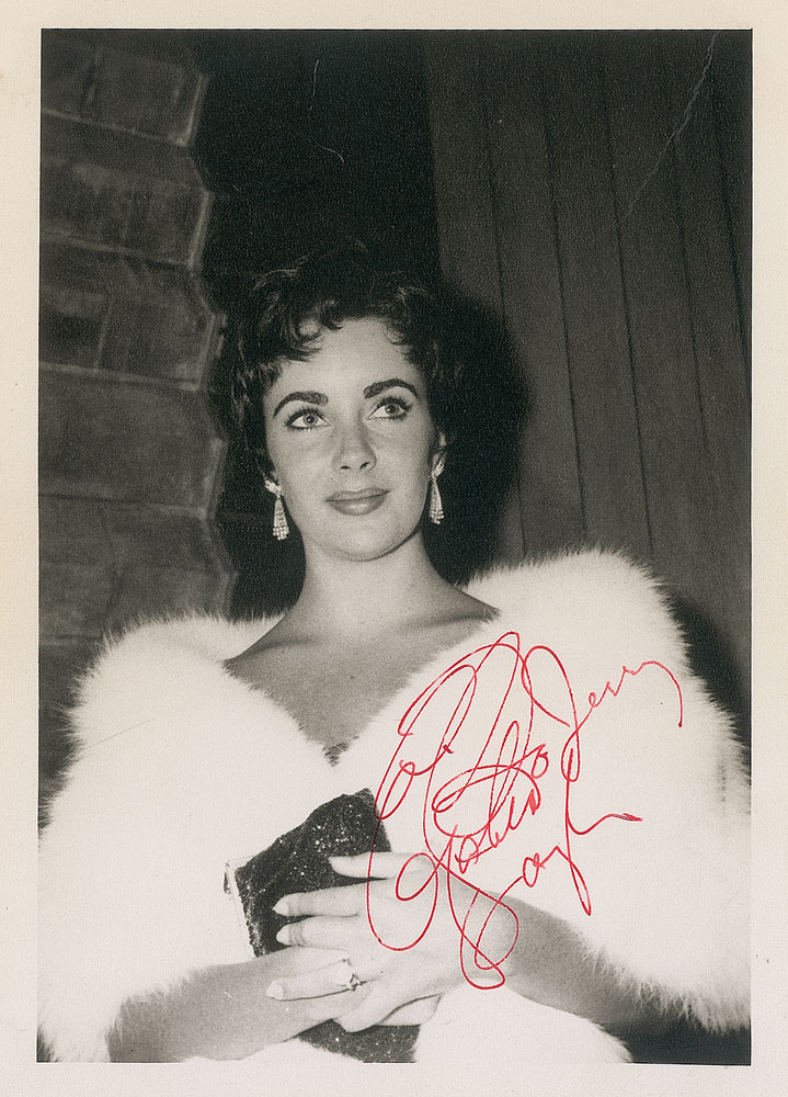 Gorgeous vintage matte-finish 5 x 7 photo of Taylor wrapped in white fur, signed and inscribed in fountain pen, “To Jerry, Elizabeth Taylor.” In fine condition, with a noticeable crease to the upper right. Pre-certified PSA/DNA and RR Auction COA.
