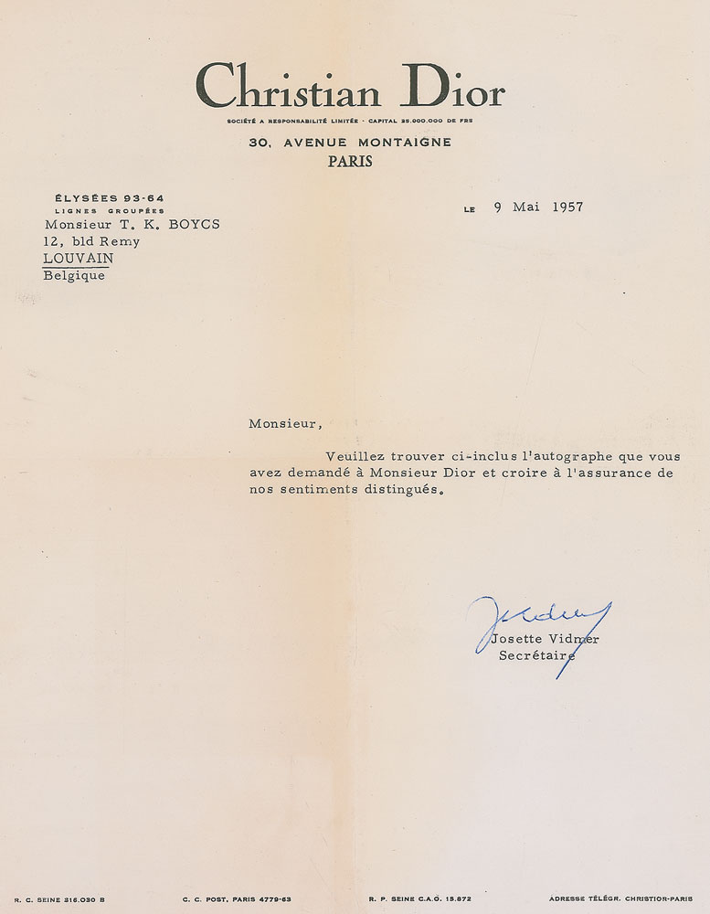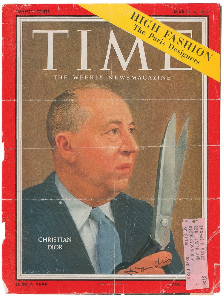 French designer (1905–1957) who earned a place as one of most influential figures in 20th century fashion. Cover for the March 4, 1957, issue of Time magazine, depicting Dior with a large pair of scissors in hand, 8.25 x 11, signed at the bottom in fountain pen. In very good condition, with several heavy intersecting folds, creases, and edge chips and tears. Accompanied by the original mailing envelope and transmittal letter from his office. Pre-certified PSA/DNA and RR Auction COA.