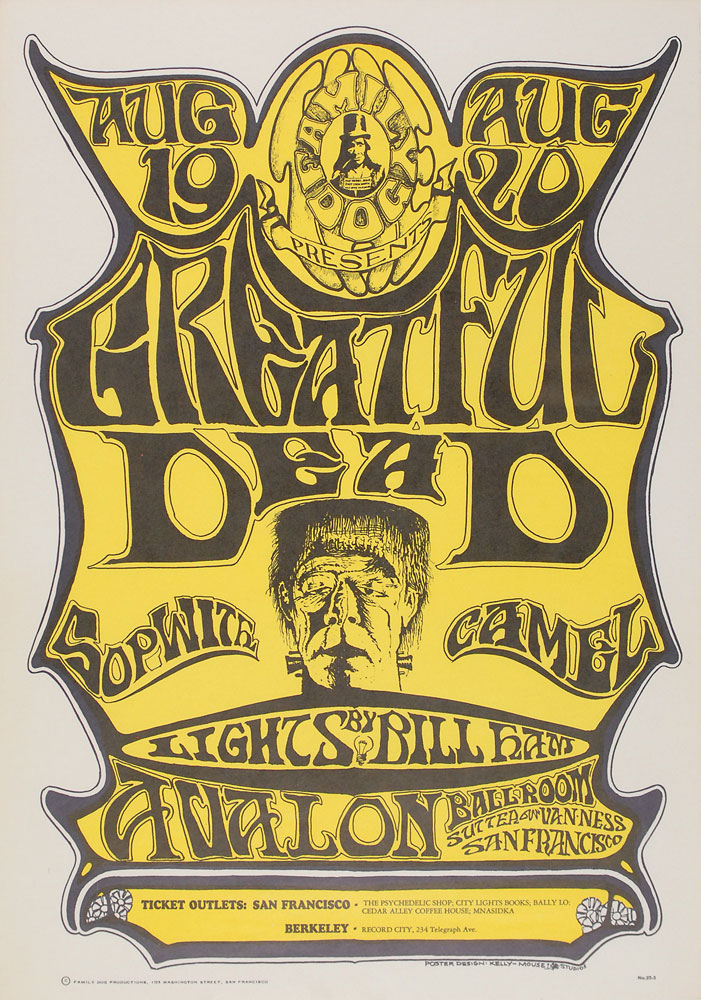 Original color 14 x 20 Family Dog poster for the Grateful Dead’s two-day appearance at the Avalon Ballroom in San Francisco in 1966. This is a third print of the poster, numbered 22-3 in the lower right corner, and features superb artwork from Stanley Mouse and Alton Kelly, with an image of Frankenstein in the lower portion of the poster. In fine condition. Rolled. This design was one of the most popular of the early Family Dog posters. RR Auction COA.