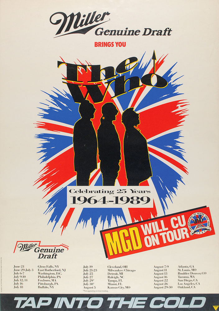 Original color promotional poster for The Who’s 25th Anniversary Tour in 1989, 21 x 30, sponsored by Miller Genuine Draft, and listing all 21 tour dates along the bottom. In fine condition, with scattered light creases and edge dings. Rolled. RR Auction COA.