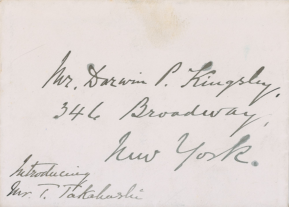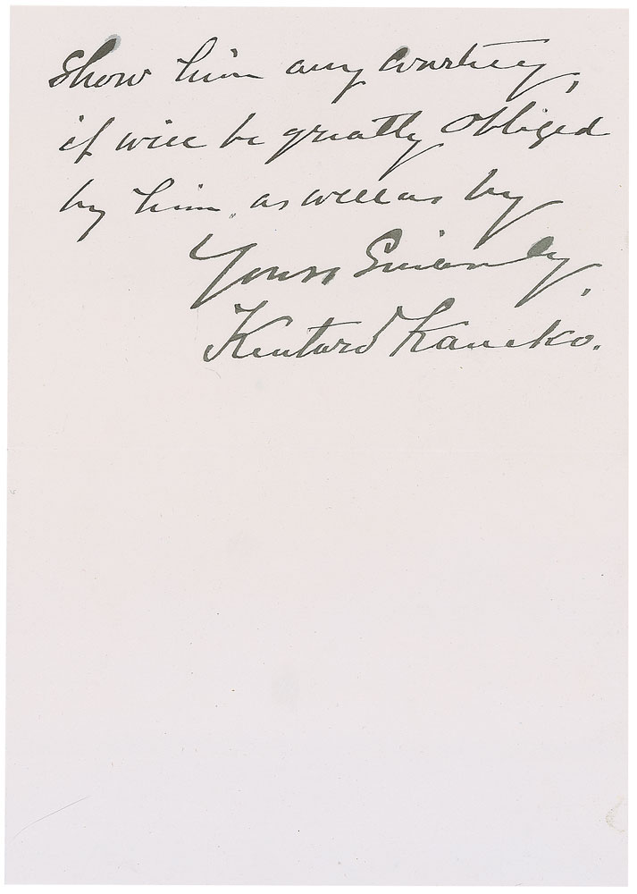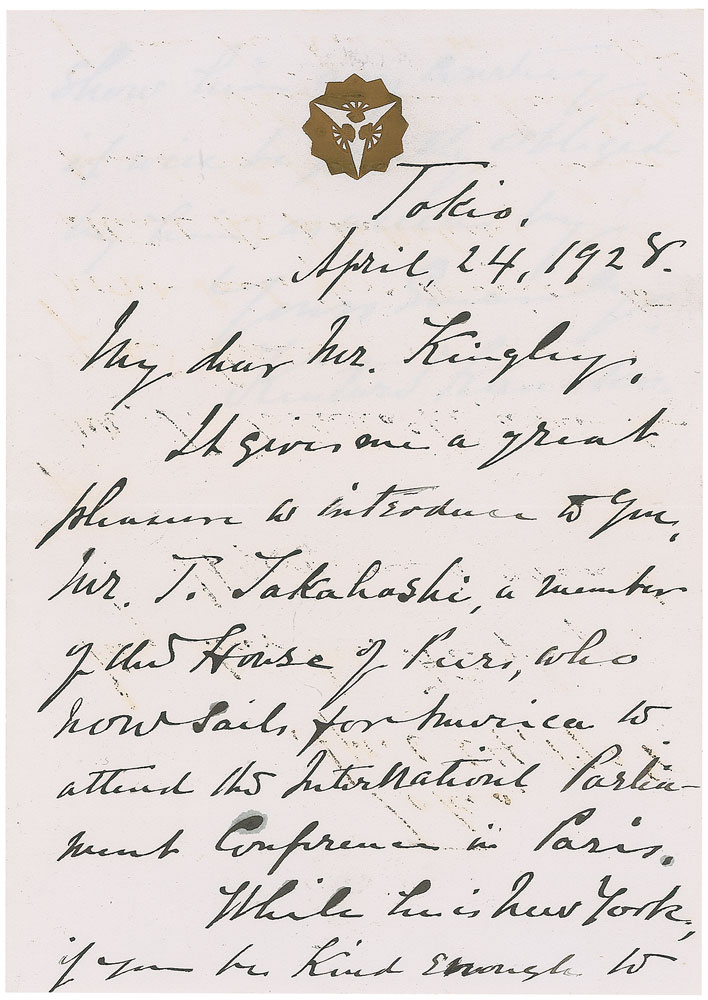 Statesman and diplomat (1853–1942) in Meiji period Japan who was a strong proponent of good diplomatic relations with the United States. ALS in English, two pages on two adjoining sheets, 5.25 x 7.25, official letterhead, April 24, 1928. Letter to Darwin P. Kingsley. In part: "It gives me great pleasure to introduce to you, Mr. T. Takahashi, a member of the House of Peers, who now sails for America to attend the International Parliament Conference in Paris.” In fine condition, with mirroring to ink. Accompanied by the original mailing envelope, addressed in Kaneko’s hand. RR Auction COA.