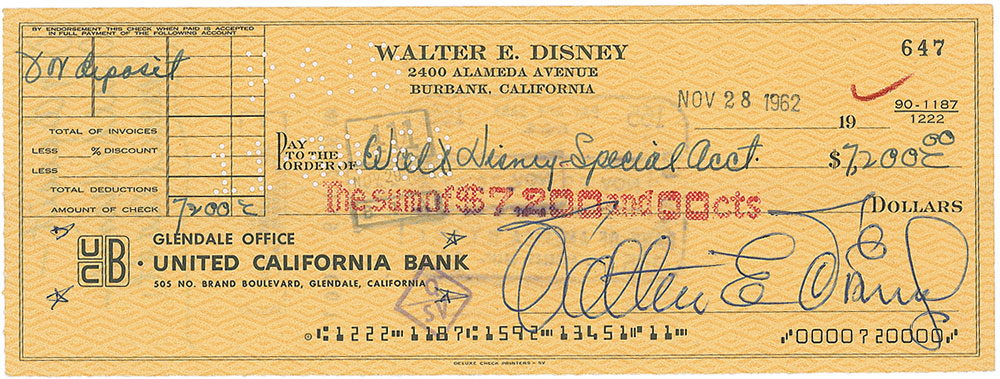 Personal check, 8.25 x 3, filled out in another hand and signed by Disney, “Walter E. Disney,” payable to Walt Disney Special Account for $7,200.00, stamp-dated November 28, 1962. In fine condition, with cancellation holes to upper portion and some show-through from stamps on reverse. Pre-certified Phil Sears COA and RR Auction COA.
