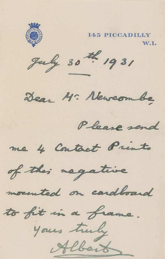 ALS signed “Albert,” one page, 4.5 x 7, personal letterhead, July 30, 1931. Letter to photographer H. S. Newcombe. In full: “Please send me 4 contact prints of this negative mounted on cardboard to fit in a frame.” Accompanied by an original matte-finish 3.75 x 4.75 photo of a young Queen Elizabeth and Princess Margaret. In fine condition. Also accompanied by the original transmittal envelope addressed in Albert’s hand. RR Auction COA.