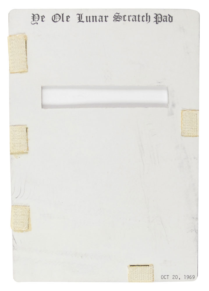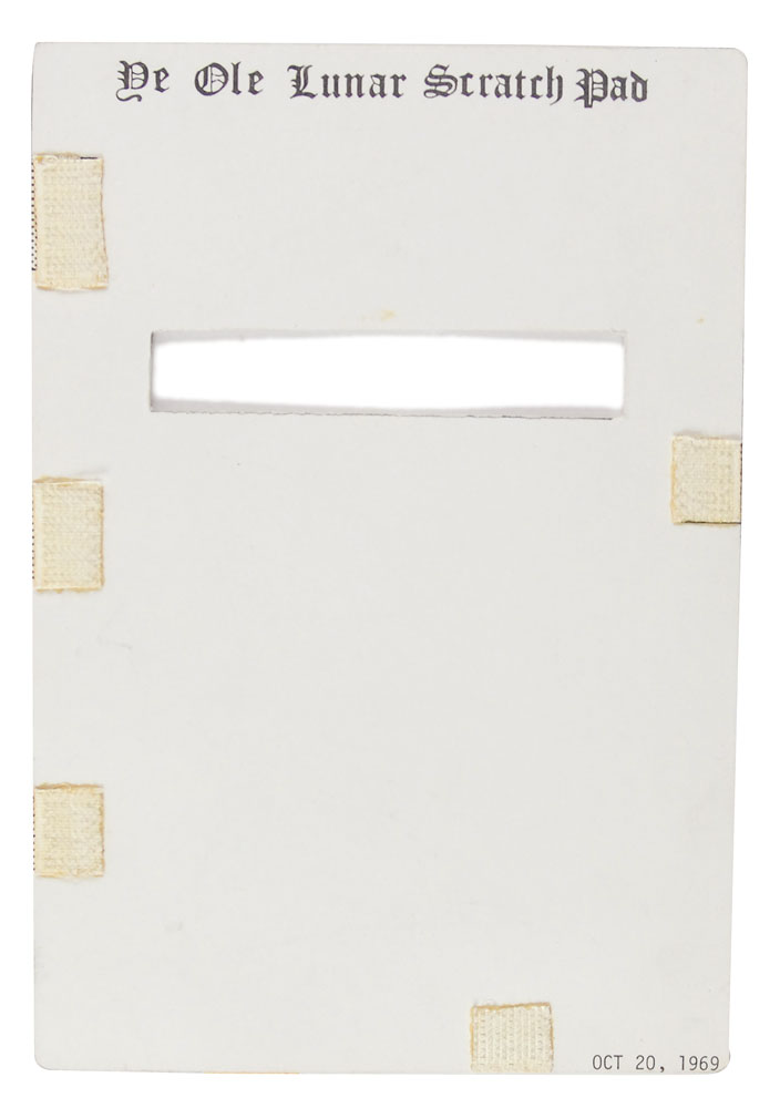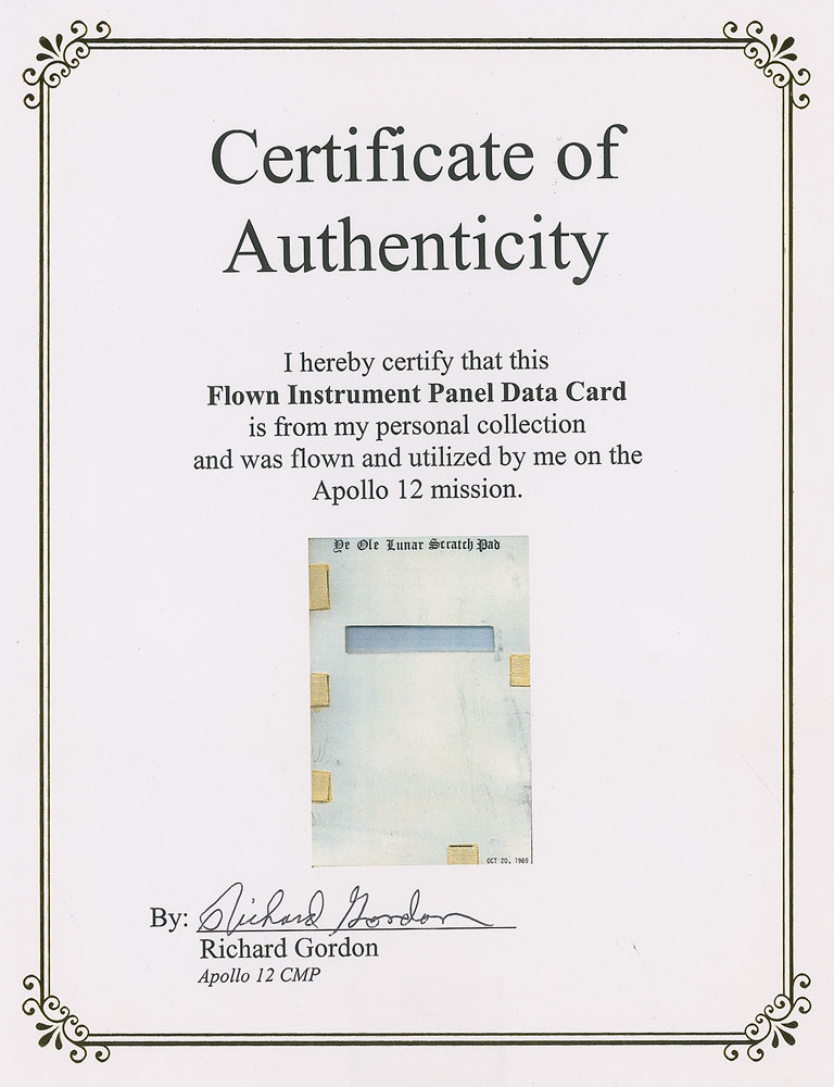 Flown instrument panel data card, flown on the Apollo 12 mission. Blank card measures 5.25 x 8, is dated October 20, 1969, in the lower corner, and is labeled along the top on both sides, “Ye Ole Lunar Scratch Pad.” Card also has five small swatches of Velcro affixed to each side. Accompanied by a certificate of authenticity from Richard Gordon which reads: “I hereby certify that this Flown Instrument Panel Data Card is from my personal collection and was flown and utilized by me on the Apollo 12 mission.” In fine condition. Pre-certified Steve Zarelli.