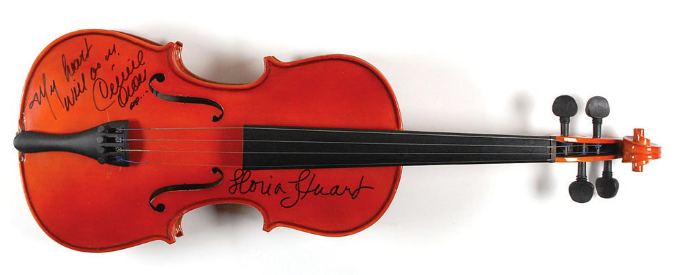 Natural wood-finish Cremona violin, signed in person in black felt tip, “My heart will go on…Celine Dion,” and “Gloria Stuart.” In fine condition. Originally obtained by in-person specialist Mike Wehrmann. Pre-certified PSA/DNA and RR Auction COA.