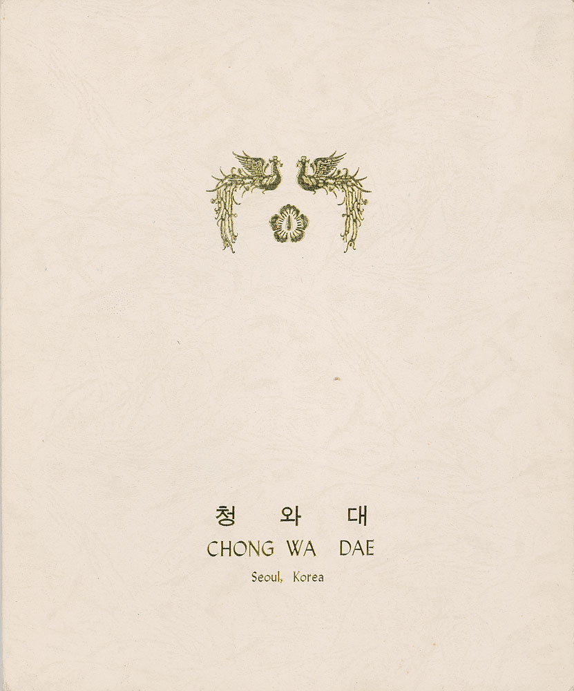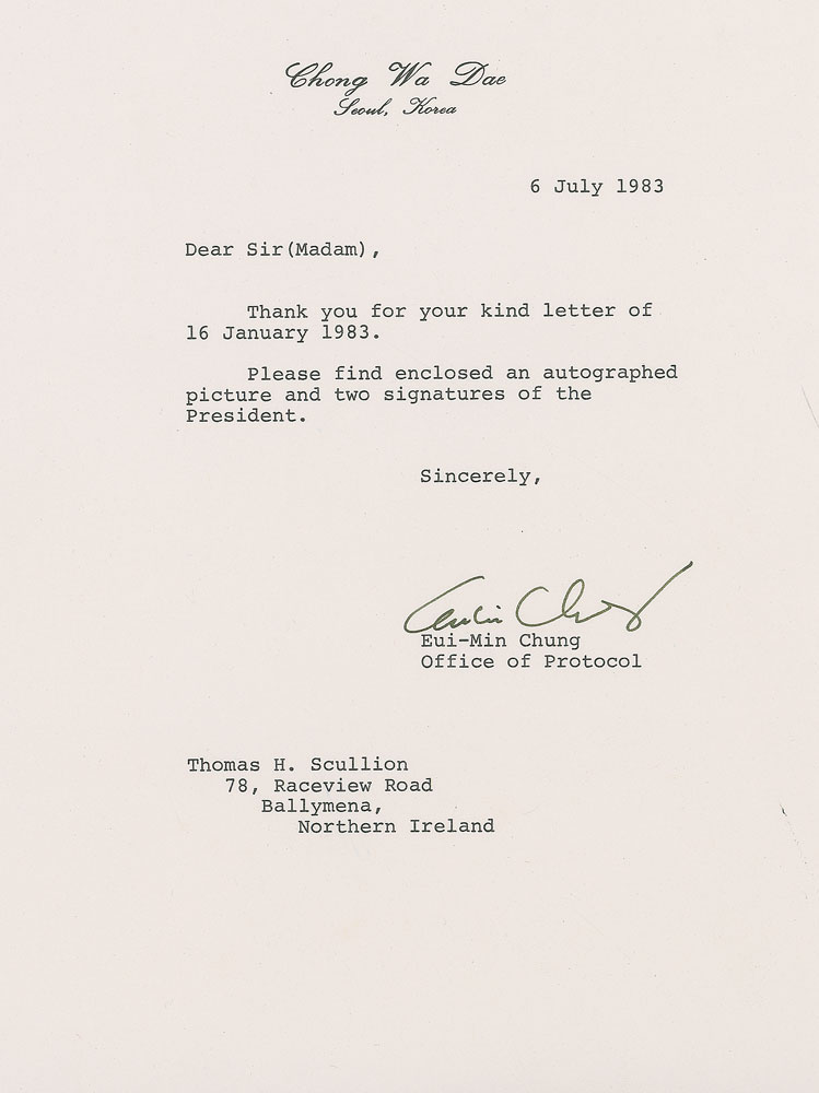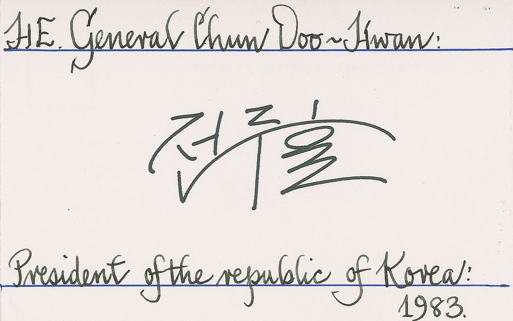 Two items: a color satin-finish 8 x 10 photo of Doo-Hwan, signed in the lower border in black felt tip; and a felt tip signature on a 5.5 x 3.5 white card, with collector’s notations to top and bottom edge. The photo is housed in its original gold-embossed 9.5 x 11.5 presentation folder. In fine condition. Accompanied by a 1983 letter from the Office of Protocol acknowledging the photo and signature. RR Auction COA.