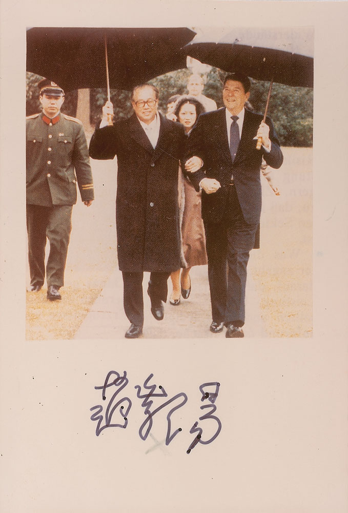 High-ranking politician in the People's Republic of China (1919–2005) instrumental in implementing free-market reforms. Color satin-finish 3.5 x 5 photo of Zhao Ziyang walking arm-in-arm with Ronald Reagan, signed in the lower border in black felt tip. In fine condition, with a light mark under signature. RR Auction COA.