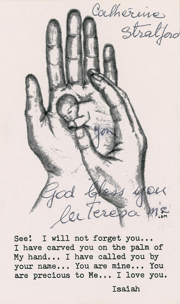 Cardstock 3.25 x 5.5 prayer card featuring an image of a small baby embraced by large hands and an applicable verse from Isaiah, signed and inscribed in black ballpoint, “Catherine Stratford, you, God bless you, M Teresa mc.” In fine condition. Pre-certified PSA/DNA and RR Auction COA.