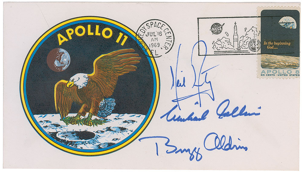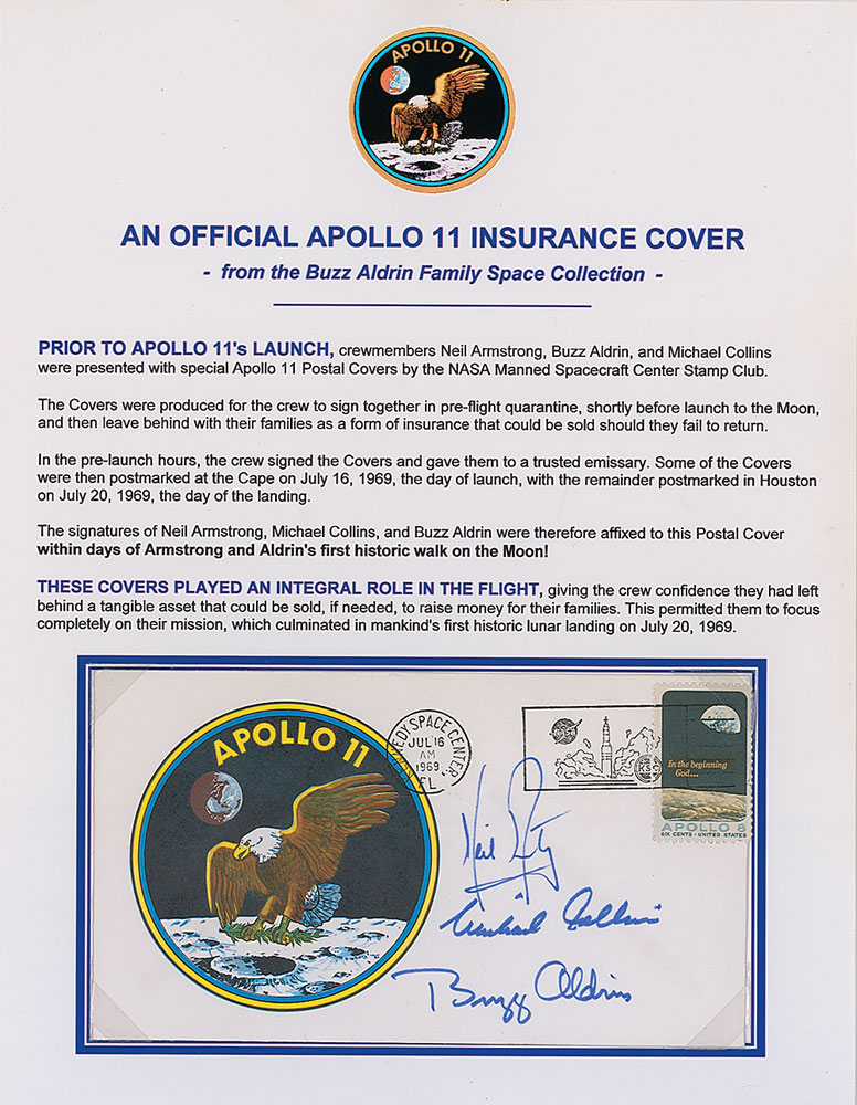 Apollo 11 'Type 3' insurance cover with a cachet of the mission insignia, bearing a July 16, 1969, Kennedy Space Center cancellation, signed in blue felt tip by Neil Armstrong, Buzz Aldrin, and Michael Collins. In very fine condition. Accompanied by a printed informational sheet stating the cover comes from the Buzz Aldrin Family collection. Produced and signed just prior to space missions in order to provide financial security for astronauts’ families in case of disaster, insurance covers are the ultimate space-related philatelic item, and one of the most sought-after formats for astronaut autographs. Pre-certified Zarelli Space Authentication.