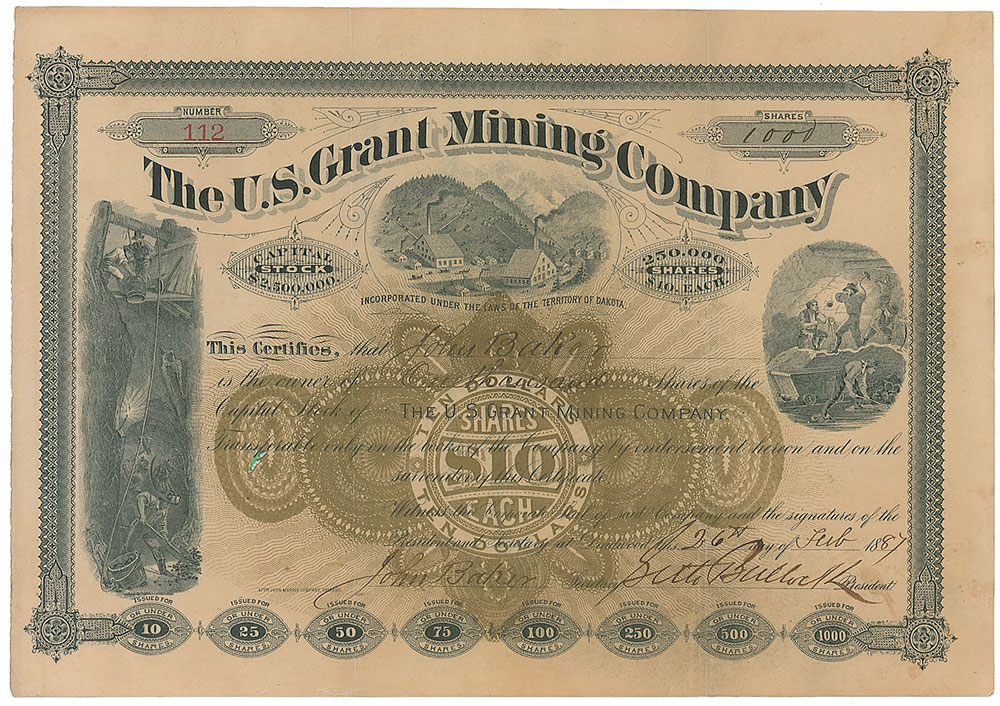 Western legend (1849–1919) who beat out Wyatt Earp for the position of first sheriff of the notorious Deadwood camp. Partly-printed DS, one page, 11 x 7.75, February 26, 1887. Certificate confirming that “John Baker is entitled to One thousand Shares of the Capital Stock of The U. S. Grant Mining Company.” Signed at the conclusion by Bullock as president of the company and countersigned by a secretary. In fine condition, with two vertical storage folds (one passing through a single letter of the signature) and a few trivial stains. RR Auction COA.