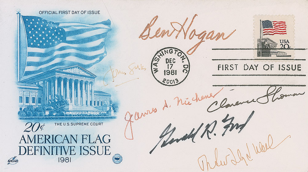 FDC with a cachet honoring the American flag, signed in felt tip by Gerald R. Ford, Clarence Thomas, Jonas Salk, James A. Michener, Andrew Lloyd Weber, and Ben Hogan. Several signatures are quite faded (with Salk’s being the lightest by a significant margin), otherwise fine condition. An unusual grouping of culturally important figures. RR Auction COA.