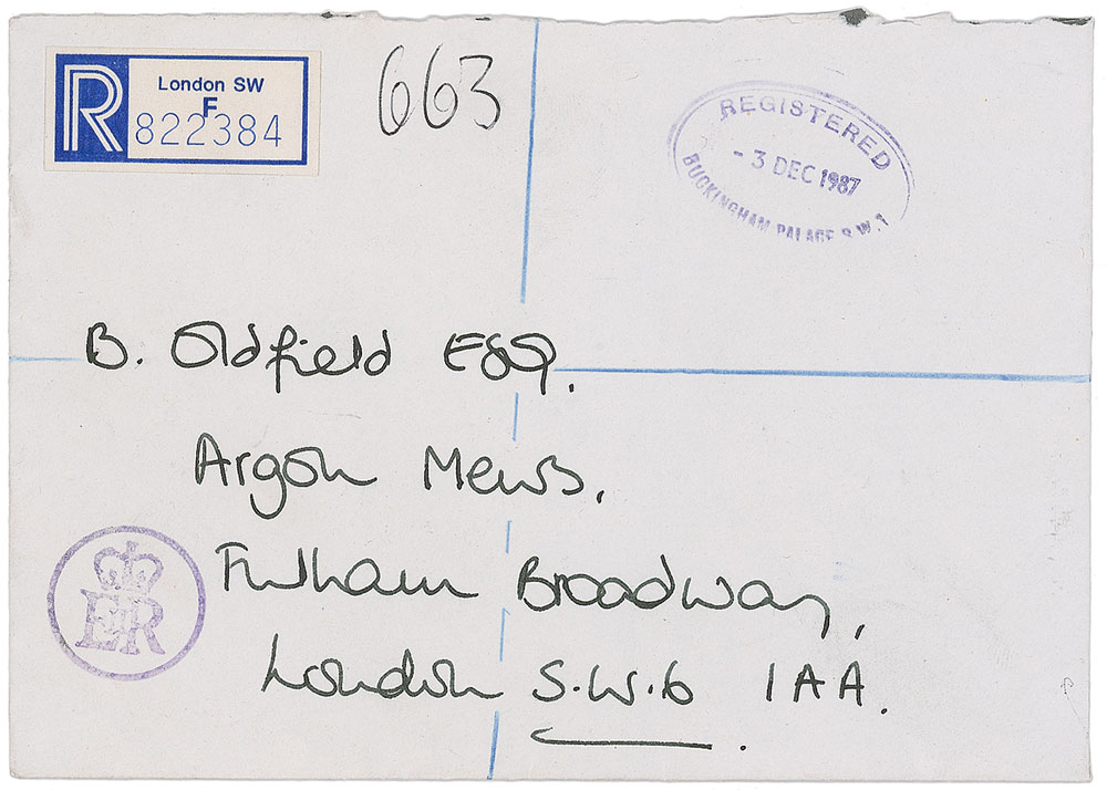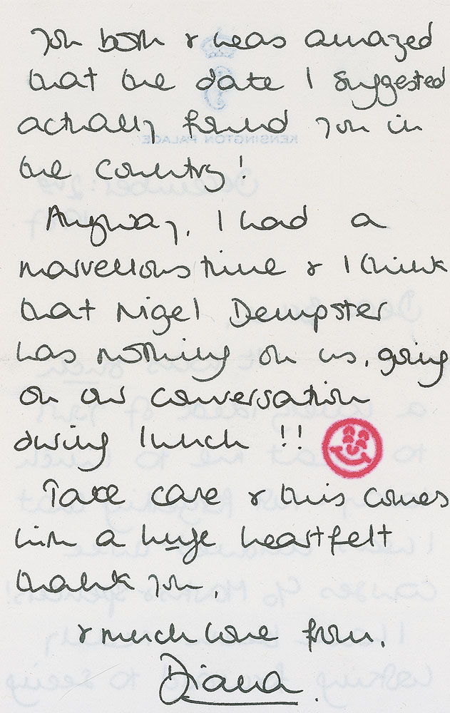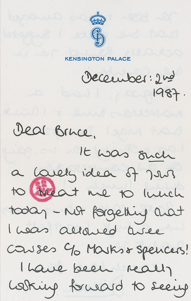 Scarce ALS, one page both sides, 4.75 x 7.5, Kensington Palace letterhead, December 2, 1987. Letter to fashion designer Bruce Oldfield. In full: “It was such a lovely idea of yours to treat me to lunch today—not forgetting that I was allowed three courses c/o Marks & Spencers! I have been really looking forward to seeing you both & was amazed that the date I suggested actually found you in the country! Anyway, I had a marvellous time & I think that Nigel Dempster has nothing on us, going on our conversation during lunch!! Take care & this comes with a huge heartfelt thank you.” In fine condition, with a small red happy face stamp on the second page showing through to the front. Accompanied by the original mailing envelope addressed in Diana’s hand. Dempster was a celebrity gossip columnist for the Daily Mail. RR Auction COA.