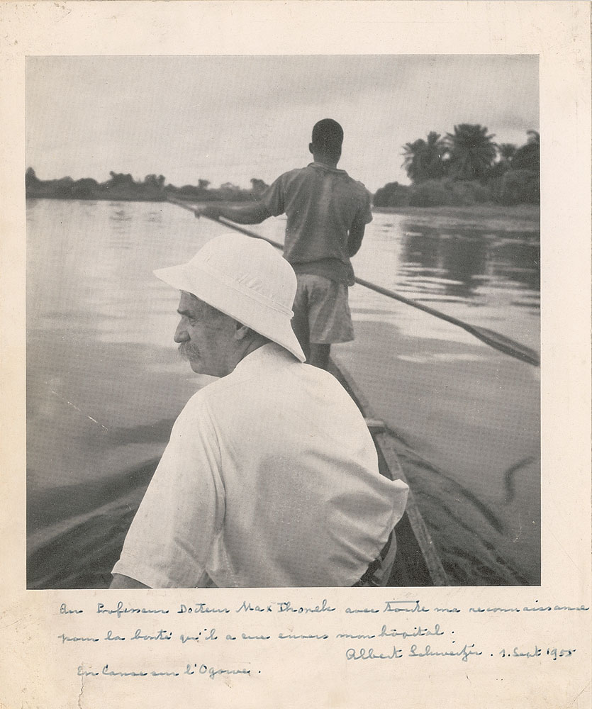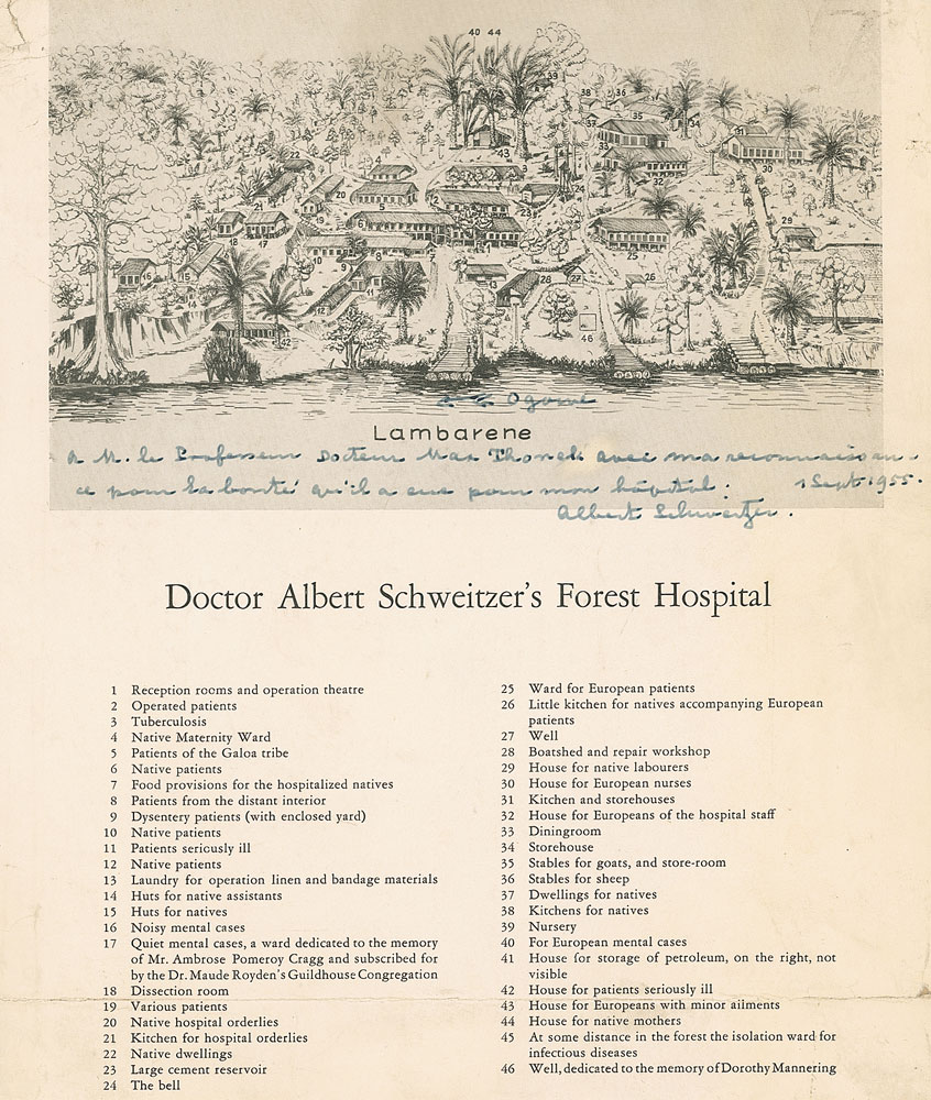Two 7.75 x 9.25 photos, each signed and inscribed in blue ink in French to renowned surgeon and collector Dr. Max Thorek, both dated September 1, 1955. The first shows a map of Schweitzer’s Forest Hospital, while the second shows the doctor being paddled up stream. Each photo is affixed to an identical size mount. Some scattered light soiling and creases, otherwise fine condition. RR Auction COA.