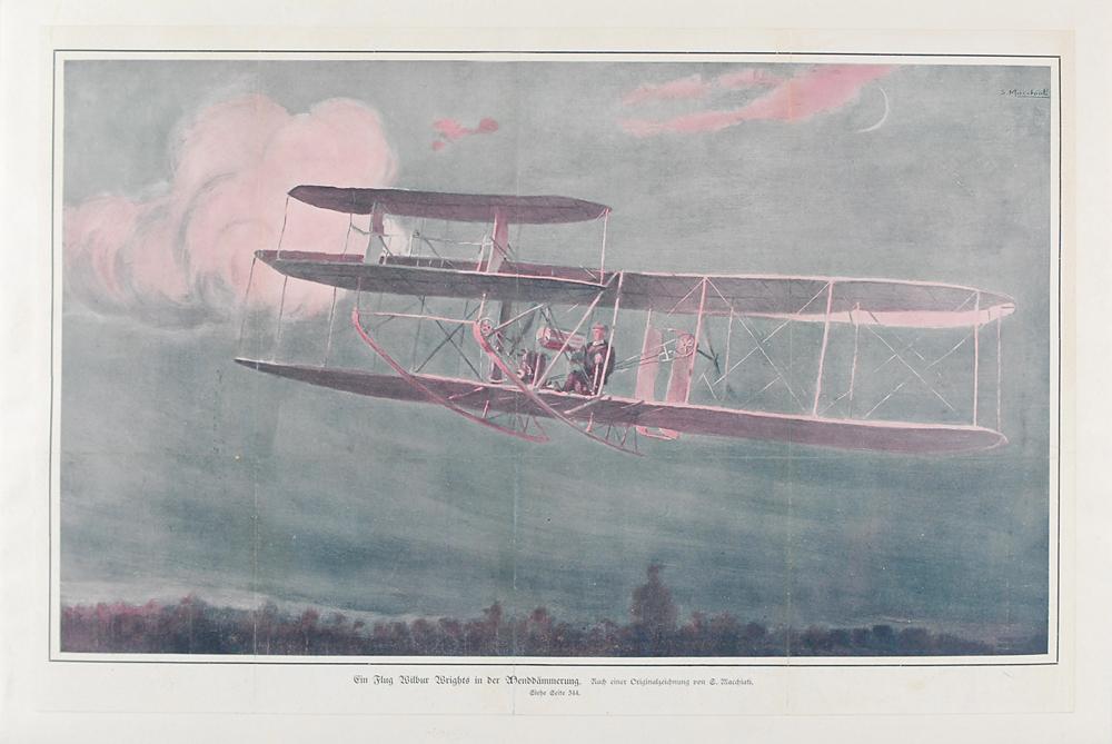 Early German color 18.5 x 12.25 print entitled ‘Ein Flug Wilbur Wright in der Abenddämmerung,’ based on an original drawing by S. Macchiati, featuring a wonderful image of Wright piloting his biplane in the twilight. Professionally linen-backed for preservation. In very good condition, with smoothed intersecting folds and restorations to small chips and separations. RR Auction COA.