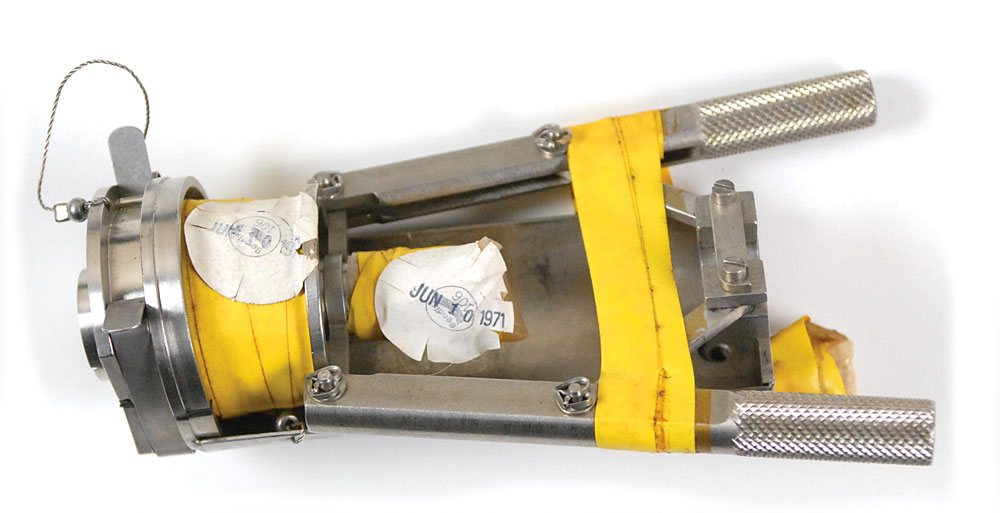Uncommon stainless steel tool for draining propellant from the Lunar Module tanks. Measuring approximately 4.5 x 7, the tool consists of a coupling to connect to an LM propellant port, and handles to move a draining hose into the port. A pan collects any leaked propellant. Part retains its original seals on the ports indicating it is clean and ready for use. One side is marked by the Grumman Aircraft Engineering Corporation, “Type IIA Ground Coupling, Serial No. 3…LSC-270-813-236.” In fine condition. RR Auction COA.