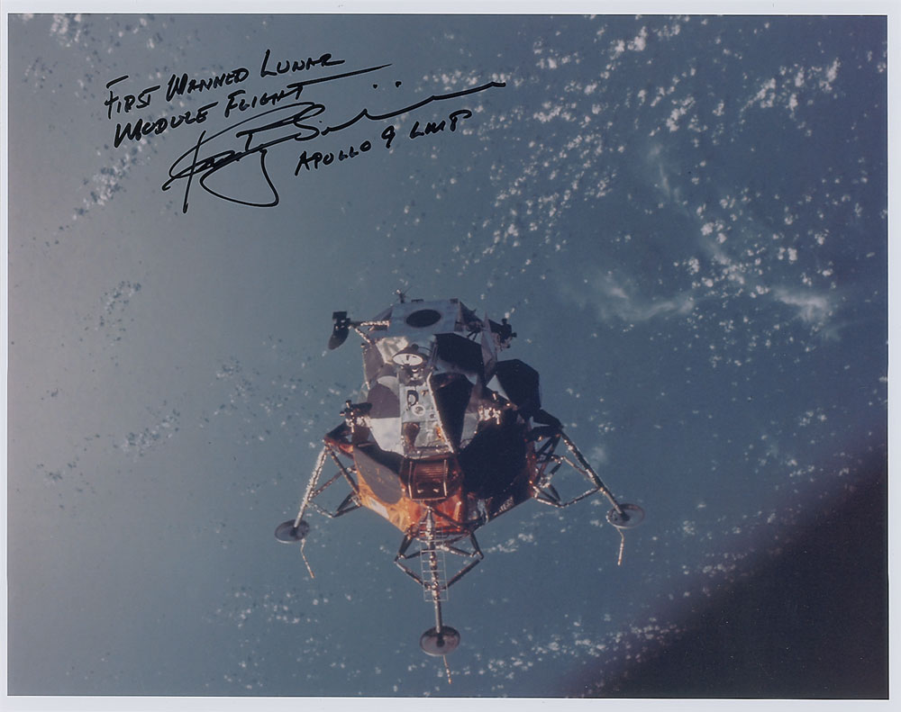 Color glossy 14 x 11 photo of the LM in orbit, signed in black felt tip, “First Manned Lunar Module Flight, Rusty Schweickart, Apollo 9 LMP.” In very fine condition. Pre-certified Steve Zarelli and RR Auction COA.