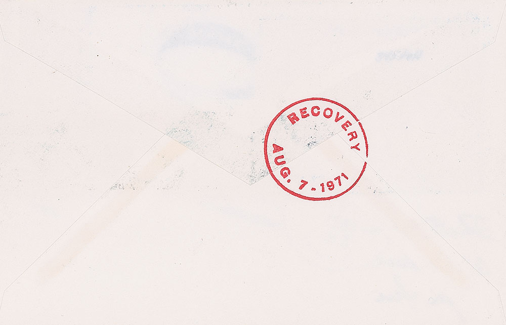 Flown ‘Phases of the Moon’ postal cover, carried into lunar orbit during the Apollo 15 mission. Cover has an affixed color cachet which shows all 15 phases of the moon, has an August 7, 1971, USS Okinawa postal cancellation, and is signed in the lower left in black felt tip by Dave Scott, Al Worden, and Jim Irwin. Cover is also numbered under the flap, “345,” and initialed by NASA’s general counsel S. Neil Hosenball. In fine condition. One hundred and forty-four of these covers, created by German stamp dealer F. Herrick, were carried in Al Worden’s PPK kit on board the Endeavour during the mission.