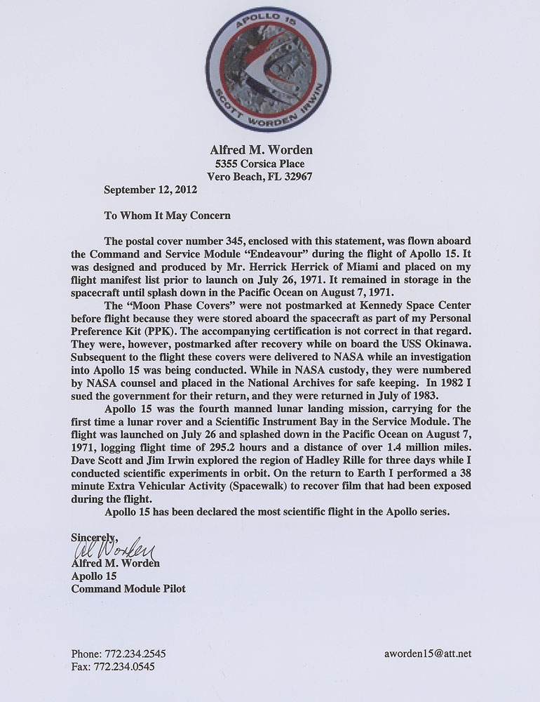 Accompanied by a one-page typed notarized certification, signed “Alfred M. Worden,” “David R. Scott,” and “James B. Irwin.” The provenance reads in part: “Postal covers were carried aboard the Apollo 15 Mission, which postal covers were stamped and postmarked at Kennedy Space Center, Florida, on the date of the launch, July 26, 1971, and carried aboard the Apollo 15 Spacecraft during the entire term of the Mission, to include landing on the moon and were returned to the Earth at the termination of the Mission on August 7, 1971…The postal covers were in the possession of one or more of the undersigned until 1972, at which time they were deposited with the United States Government…The undersigned have this date inspected Postal Cover No. 108, bearing NASA Serial No. 290, and aver, affirm and certify that said Postal Cover is a cover which was carried aboard the United States Lunar Mission—Apollo 15.” Also accompanied by a 2012 letter of authenticity from Al Worden, which reads, in part: “The postal cover numbered 345…was flown aboard the Command and Service Module ‘Endeavour’ during the flight of Apollo 15. It was designed and produced by Mr. Herrick and placed on my flight manifest list prior to launch…The ‘Moon Phase Covers’ were not postmarked at Kennedy Space Center before flight because they were stored aboard the spacecraft as part of my Personal Preference Kit (PPK). The accompanying certification is not correct in that regard. They were, however, postmarked after recovery while on board the USS Okinawa.” These unique covers are quite controversial regarding how many were actually produced, believed by many experts to be more than originally indicated. The rare notarized certification present with this example provides rock solid proof of its authenticity. Pre-certified Steve Zarelli and RR Auction COA.