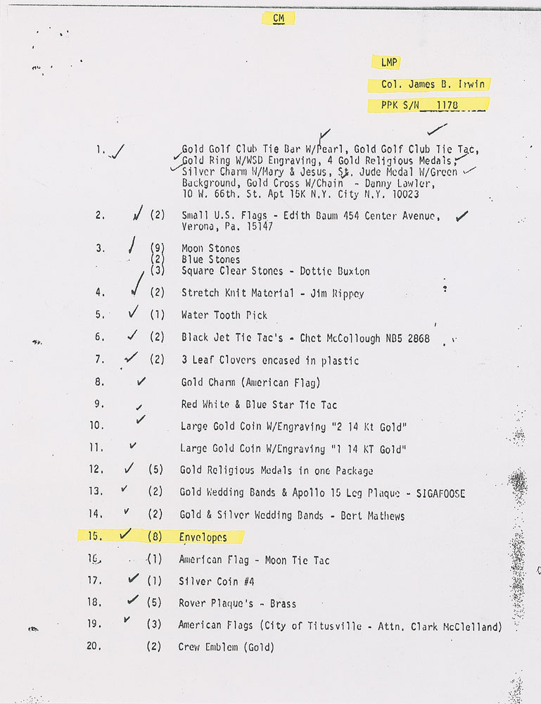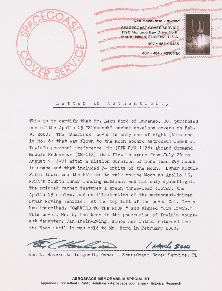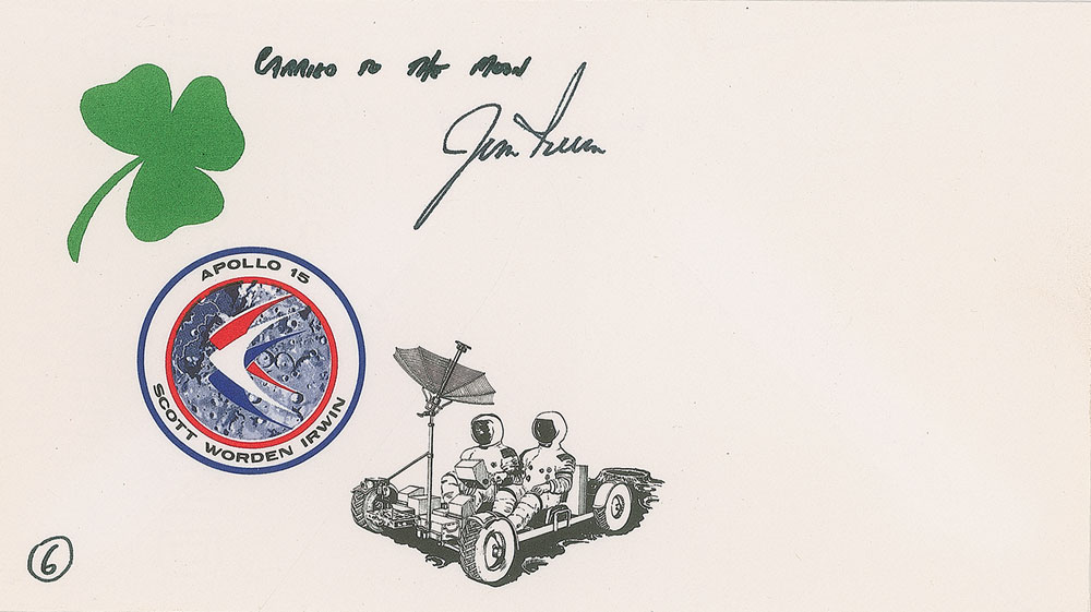 Very rare Apollo 15 flown 'Shamrock' cover with cachets of a green shamrock, a small Apollo 15 emblem, and a rendering of the Lunar Rover with two astronauts, signed in black felt tip, “Carried to the moon, Jim Irwin,” and numbered “6” in the lower left corner. In very fine condition. Accompanied by a letter of authenticity from Ken Havekotte stating, “This cover, No. 6, has been in the possession of Irwin’s youngest daughter…since her father returned to the moon until it was sold…in February 2000.” Also included is a photocopy of the manifest of Irwin’s PPK listing the covers. Only eight of these covers were flown to the moon with Irwin and research shows only one having been sold at public auction in the last 15 years. Pre-certified Steve Zarelli and RR Auction COA.