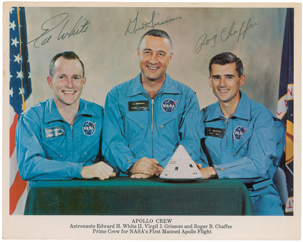 Very rare official color 10 x 8 NASA lithograph of the Apollo 1 crew posing in their blue flight suits with a model of their capsule, signed in black felt tip, “Ed White,” “Gus Grissom,” and “Rog[er] Chaffee.” In fine condition, with a couple of trivial creases near top edge. A handsome example of the scarcest of all the Apollo crew-signed portraits. Pre-certified Steve Zarelli and RR Auction COA.