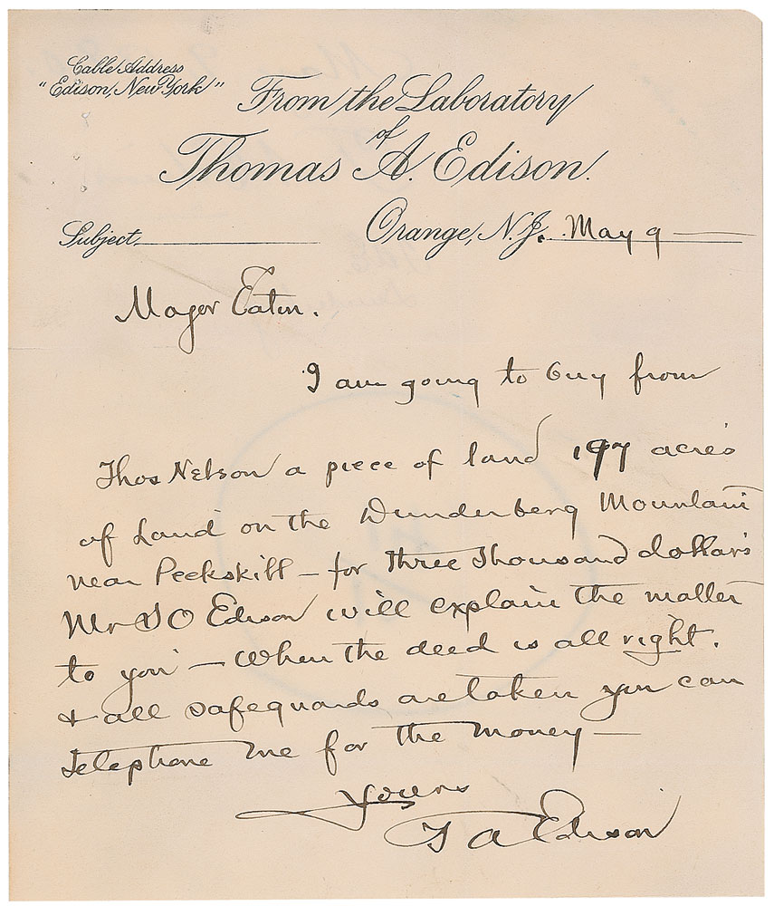 ALS signed “T. A. Edison,” one page, 5.5 x 6.5, The Laboratory of Thomas A. Edison letterhead, May 9, no year. Letter to Major Eaton. In full: “I am going to buy from Thos Nelson a piece of land 197 acres of Land on the Dunderberg Mountains near Peekskill—for three thousand dollar’s. Mr S O Edison will explain the matter to you—When the deed is all right & all safeguards are taken you can telephone me for the money.” Several dockets and notations in another hand are on the reverse. Intersecting folds, one in between initials, a diagonal crease to upper portion, staple holes to top left, and some scattered soiling, otherwise fine condition. In 1888, Edison had created a method for using electromagnets to separate and refine iron ore. Unfortunately, the iron ore produced was lower in quality than expected, the machinery broke down often, and the fine, crushed iron was difficult to work with. An exceptionally desirable early Edison letter. Pre-certified PSA/DNA and RR Auction COA.