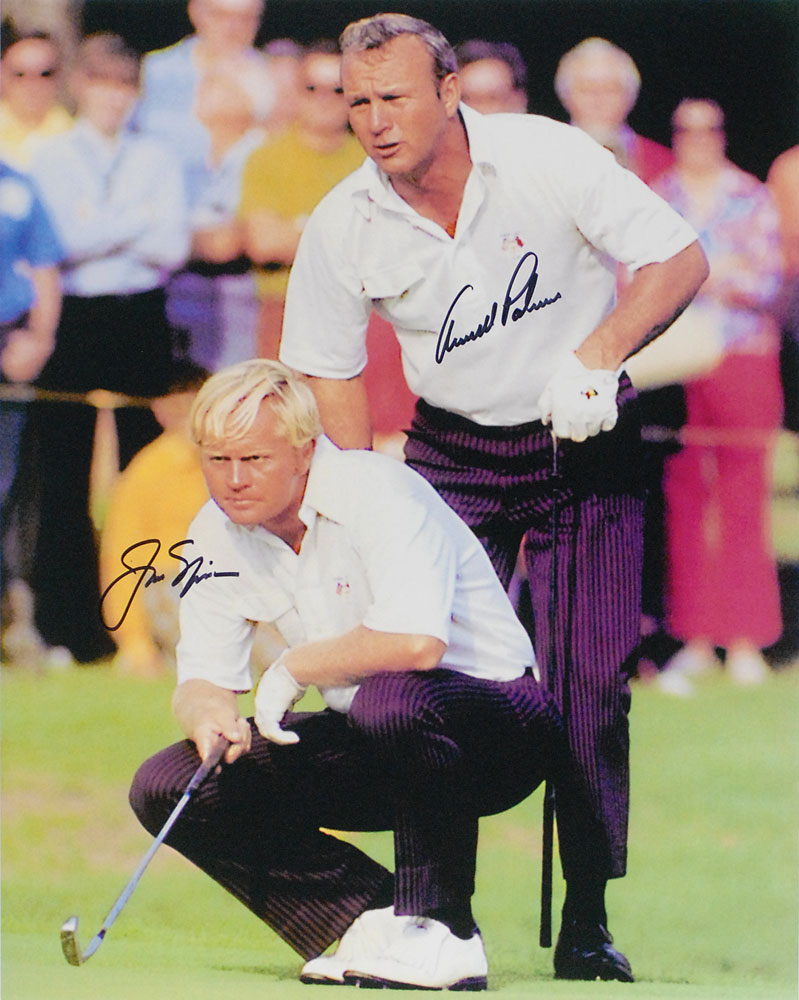 Color satin-finish 16 x 20 photo of Palmer and Nicklaus together on the golf course, signed in black felt tip by both golfing greats. In fine condition, with a grainy image quality. Pre-certified Steve Grad/PSA/DNA and RR Auction COA.