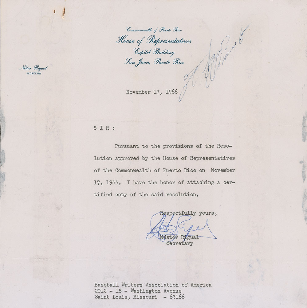 Ballpoint signature, “Roberto Clemente,” at the top of an 8.5 x 8.5 letter from the secretary of Puerto Rico’s House of Representatives Nestor Rigual sent to the Baseball Writers Association of America, dated November 17, 1966, transmitting an approved resolution. A few small edge tears, rusty paperclip impression to the upper left, and a few creases, otherwise fine condition. Clemente grew up in Puerto Rico and won the MVP Award in 1966, so the resolution was likely passed in recognition of his achievements. Pre-certified Steve Grad/PSA/DNA and RR Auction COA.