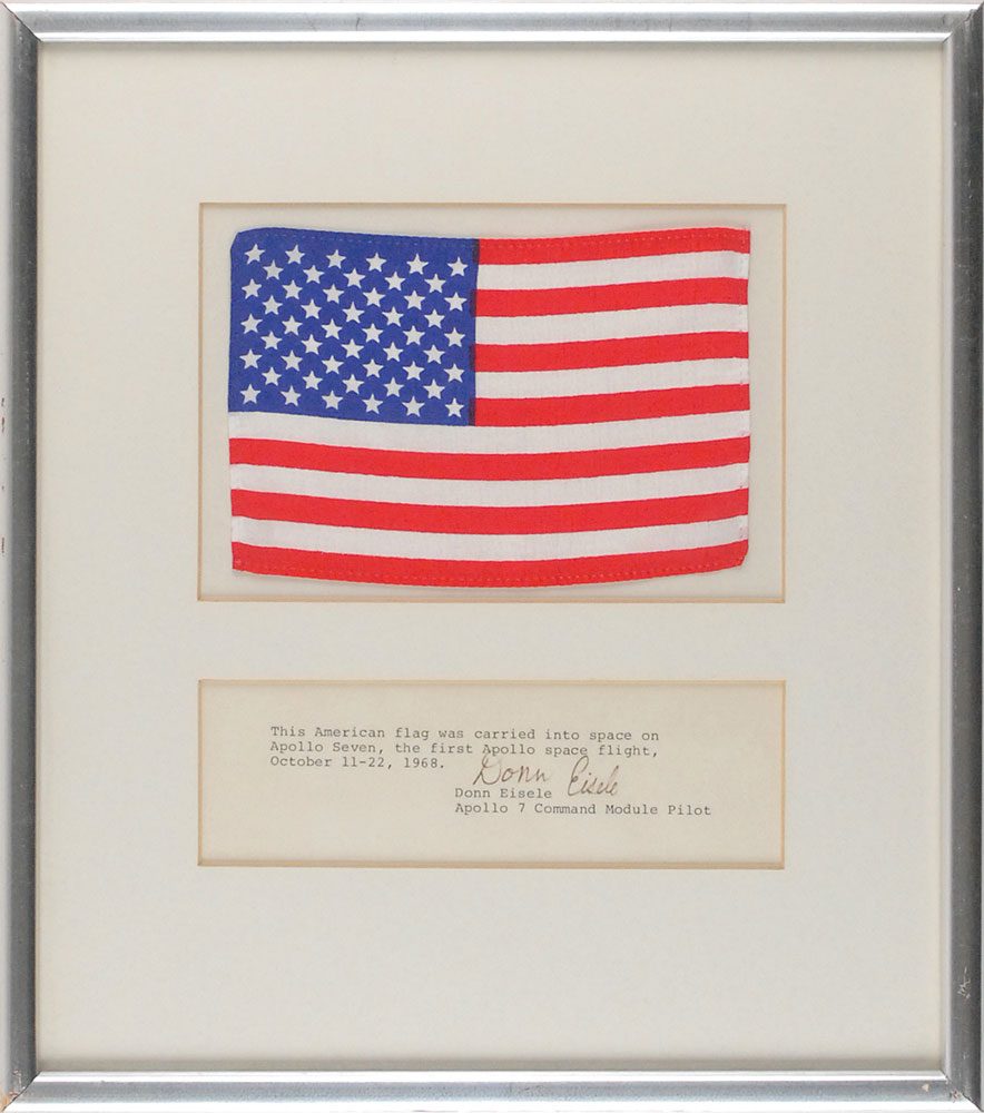 Flown American flag, 6 x 4, carried into Earth orbit on board Apollo 7. Flag is affixed to a mount which bears a statement of authenticity signed by crew member Donn Eisele which states: “This American flag was carried into space on Apollo Seven, the first Apollo space flight, October 11-22, 1968.” Matted and framed to an overall size of 11 x 12.5. In fine condition. Pre-certified Steve Zarelli and RR Auction COA.