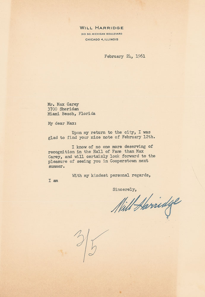 TLS, one page, 7.25 x 10.5, personal letterhead, February 24, 1961. Letter to former Pittsburgh Pirates center fielder Max Carey. In part: “I know of no one more deserving of recognition in the Hall of Fame than Max Carey, and will certainly look forward to the pleasure of seeing you in Cooperstown next summer.” In fine condition, with a slightly irregular block of overall toning and pencil notations to the bottom. Carey played in the Major Leagues from 1910 to 1929, and finished his career with a total of 738 stolen bases—a National League record unsurpassed until 1974. Pre-certified Steve Grad/PSA/DNA and RR Auction COA.