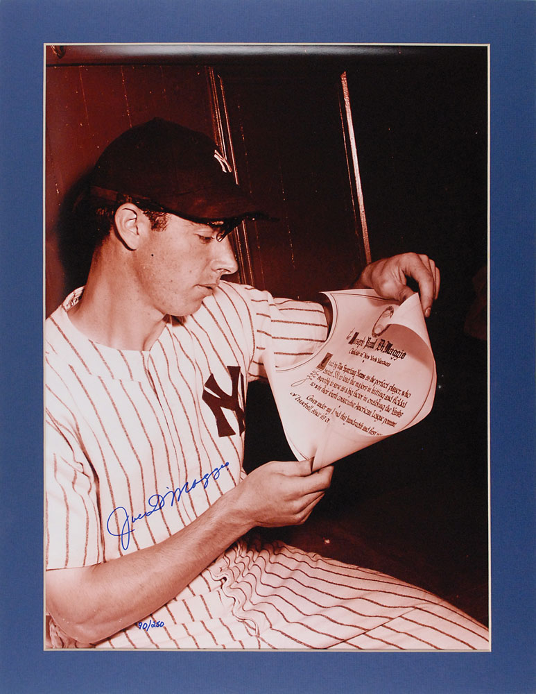 Limited edition matte-finish 14 x 19 photo of DiMaggio on the occasion of his 1939 American League MVP selection, numbered 90/250, and signed in blue felt tip. Matted to an overall size of 17 x 22. In fine condition, with mild bends from matting. Pre-certified Steve Grad/PSA/DNA and RR Auction COA.