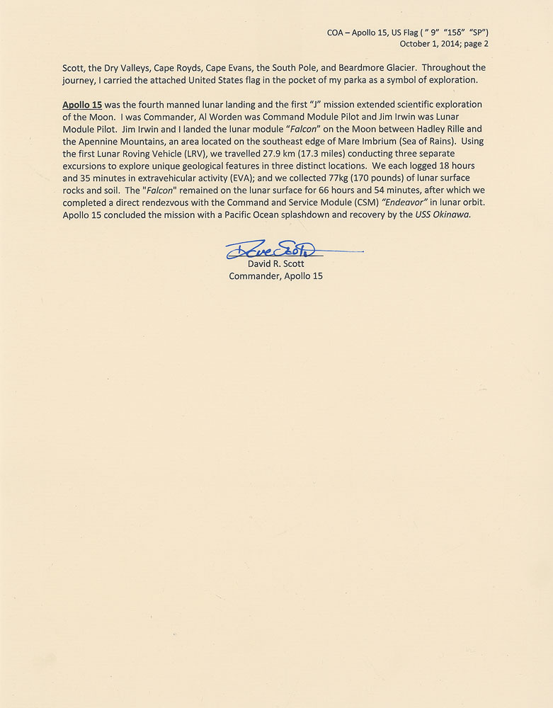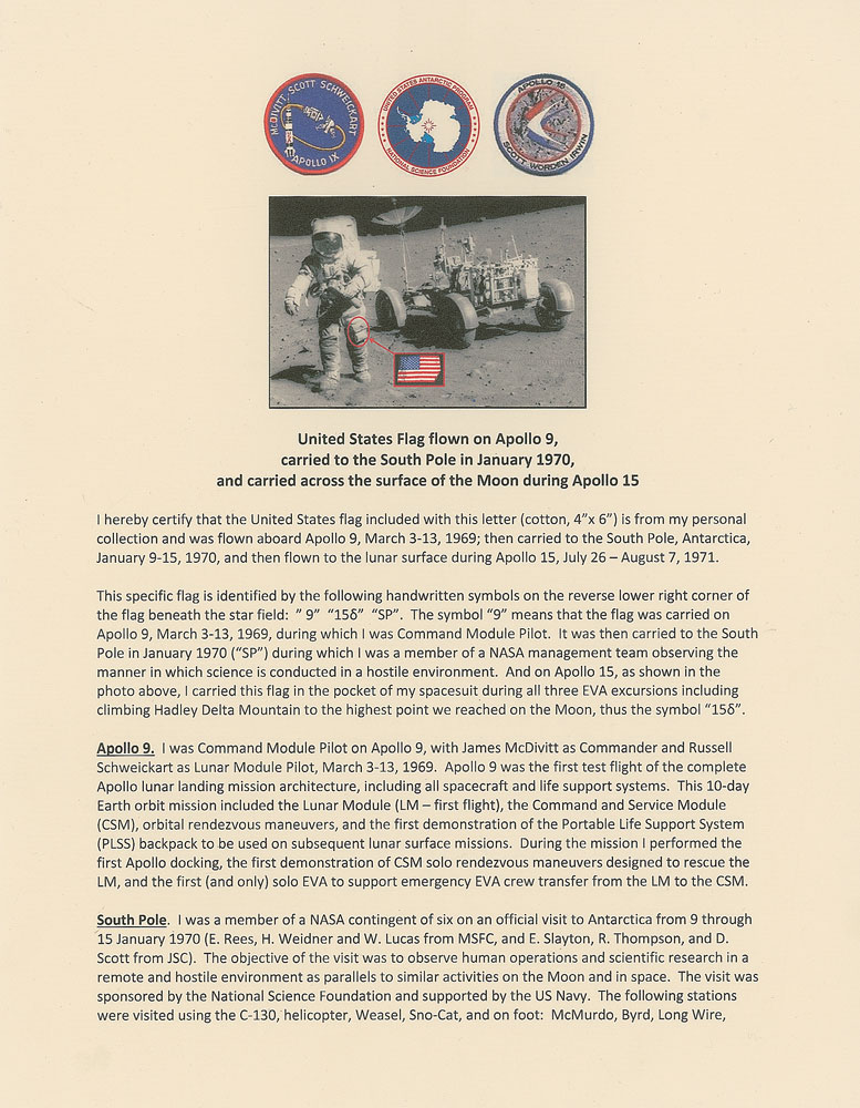 Flown American flag, 5.5 x 4, flown to the lunar surface during the Apollo 15 mission, flown on board Apollo 9, and carried to the South Pole in 1970. Scott has identified the flag as such by writing the following symbols on the reverse lower right corner, “9,” [Apollo 9] “15?,” [Apollo 15, Delta] and “SP” [South Pole]. Accompanied by a signed letter of authenticity from Dave Scott stating, in part, “I hereby certify that the United States flag included with this letter…is from my personal collection and was flown aboard Apollo 9…then carried to the South Pole, Antarctica…and then flown to the lunar surface during Apollo 15…This specific flag is identified by the following handwritten symbols on the reverse lower right corner of the flag beneath the star field: ‘9’ ‘15?’ ‘SP.’ The symbol ‘9’ means that the flag was carried on Apollo 9...it was then carried to the South Pole...’SP’ during which I was a member of a NASA management team observing the manner in which science is conducted in a hostile environment...and on Apollo 15...I carried this flag in the pocket of my spacesuit during all EVA excursions including climbing Hadley Delta Mountain to the highest point we reached on the Moon, thus the symbol ‘15?.’” In fine condition. An incredibly well-traveled flag, with the distinction of having accompanied Commander Scott during all Apollo 15 EVA excursions, including the climbing of Hadley Delta Mountain. Pre-certified Steve Zarelli and RR Auction COA.