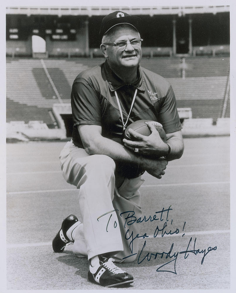 Football coach (1913–1987) who is best remembered for his 28-year tenure at Ohio State. Glossy 8 x 10 photo of Hayes kneeling with a football in hand, signed and inscribed in black felt tip, “To Barrett, Yea Ohio! Woody Hayes.” In fine condition, with a JSA label affixed to the reverse. Accompanied by a certificate of authenticity from JSA. Pre-certified Steve Grad/PSA/DNA and RR Auction COA.
