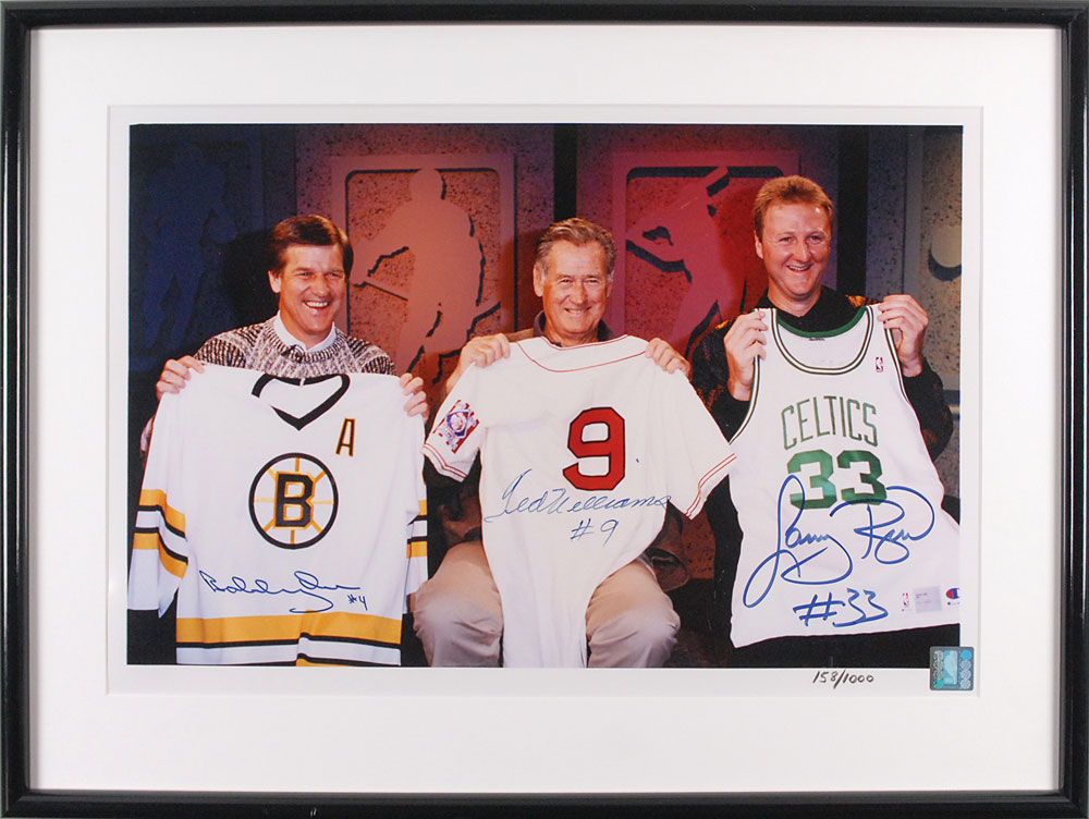 Limited edition color satin-finish 19.5 x 13 photo of Bobby Orr, Ted Williams, and Larry Bird holding up their jerseys, numbered 158/1000, signed in felt tip by all three, with each adding his uniform number. Attractively matted and framed to an overall size of 24.5 x 18.5. In fine condition. Oversized. Pre-certified Steve Grad/PSA/DNA and RR Auction COA.