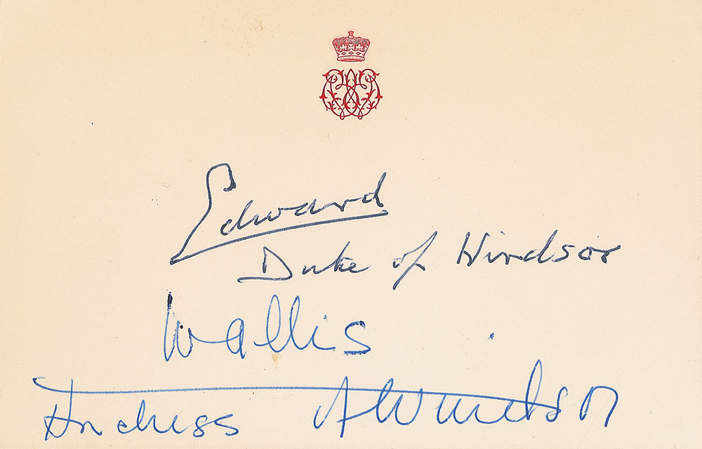 Ballpoint signatures, “Edward, Duke of Windsor” and “Wallis, Duchess of Windsor,” on an off-white 5.25 x 3.5 stationery card embossed with a royal crest. In fine condition. Pre-certified PSA/DNA and RR Auction COA.