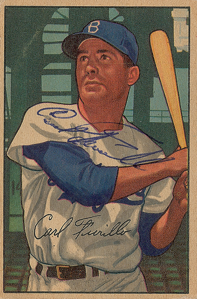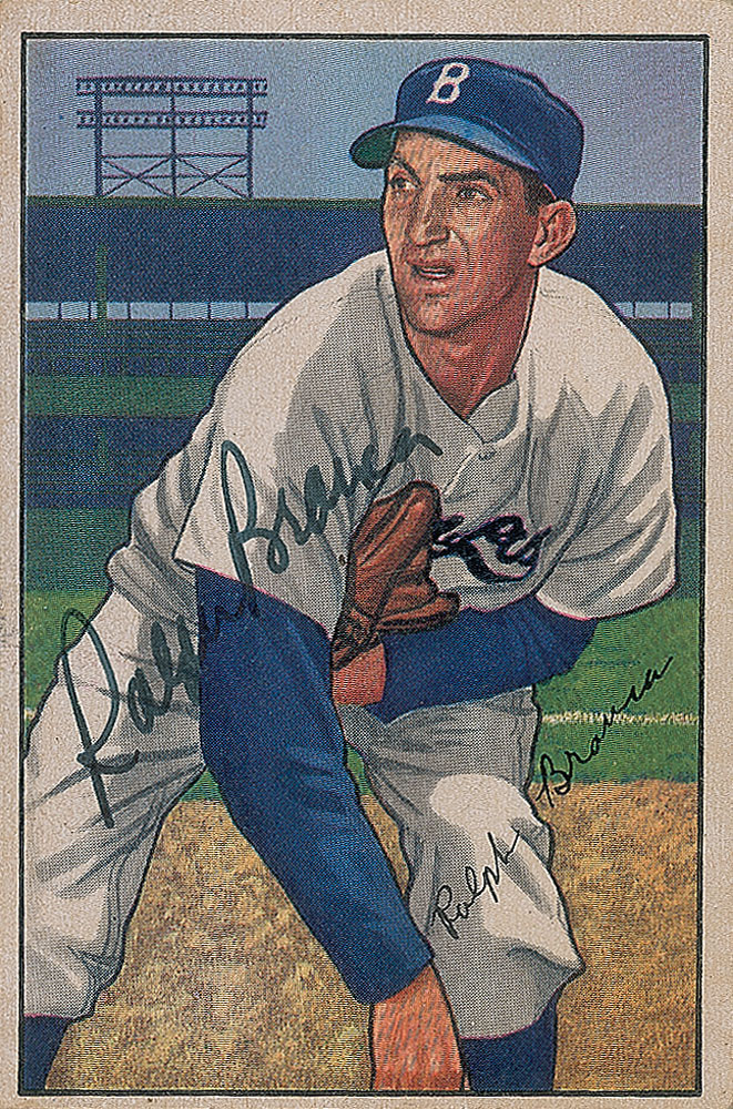 Five original 1952 Bowman baseball cards, each signed in ink by the classic Dodgers player pictured, including: Carl Furillo, Ralph Branca, Chuck Dressen, Carl Erskine, and Cal Abrams. In overall very good condition, with toned tape to corners of the Dressen card and haloing to Abrams’s signature. RR Auction COA.