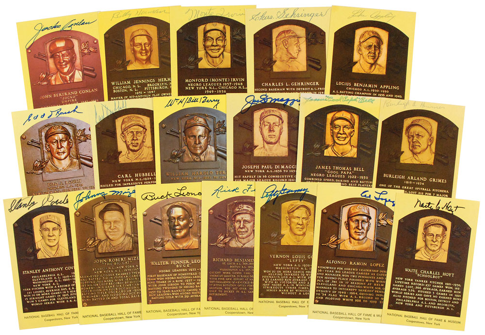 Collection of 18 gold Hall of Fame plaque cards, each signed in felt tip or ballpoint by the Hall of Famer pictured, including: Joe DiMaggio, Burleigh Grimes, Waite Hoyt, James ‘Cool Papa’ Bell, Bill Terry, Carl Hubbell, Edd Roush, Luke Appling, Charles Gehringer, Monte Irvin, Billy Herman, Jocko Conlan, Al Lopez, Lefty Gomez, Rick Ferrell, Buck Leonard, Johnny Mize, and Stan Coveleski. In overall very good to fine condition. RR Auction COA.